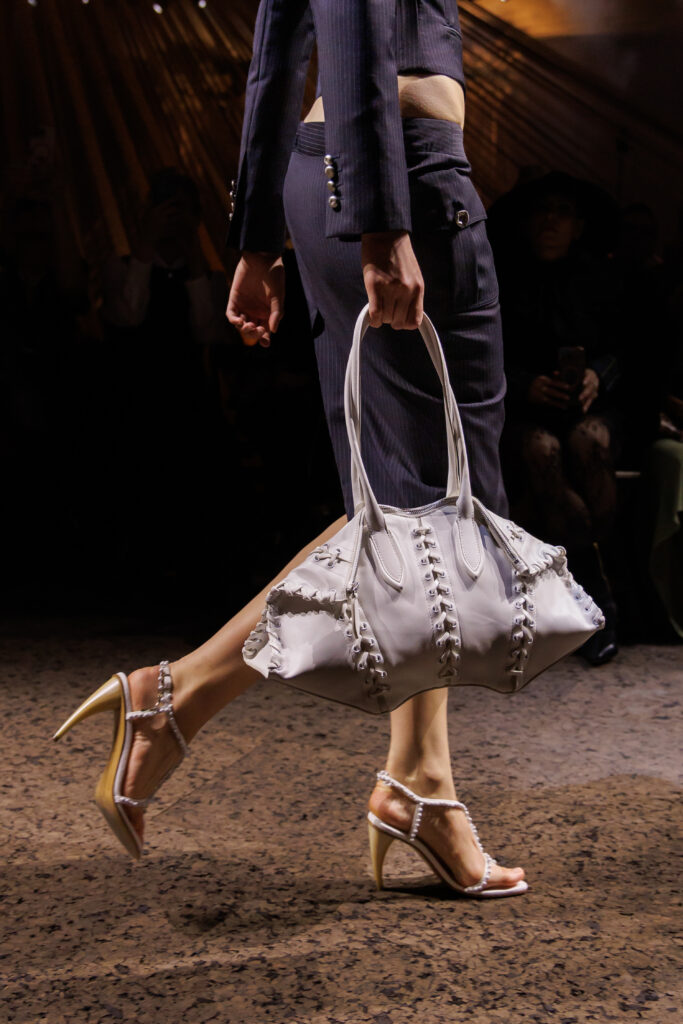 The Manta bag, a new version of the De Manta, is finished with lacing, fringe, and flame motifs. Horn-heeled boots known as the Pirate boots, first shown in 2003, reappear in leather, suede, and floral jacquard. Jewelry pieces feature scissors, insects, and wishbones as small talismans. All draw from the house’s, while reflecting McGirr’s ability to preserve the intensity of the original Alexander McQueen era while grounding it in a modern, pragmatic sensibility.