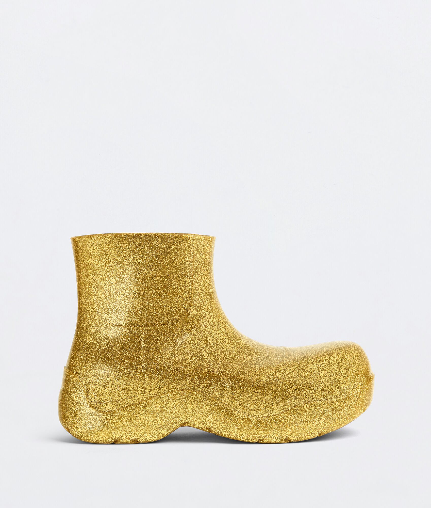 Bottega knows how to party, and these shoes will let you party all night. Italian-made with cotton lining, these molded platform shoes are fluid and glittery, with a metallic gold finish to the 100% rubber shape. Dance the night away.