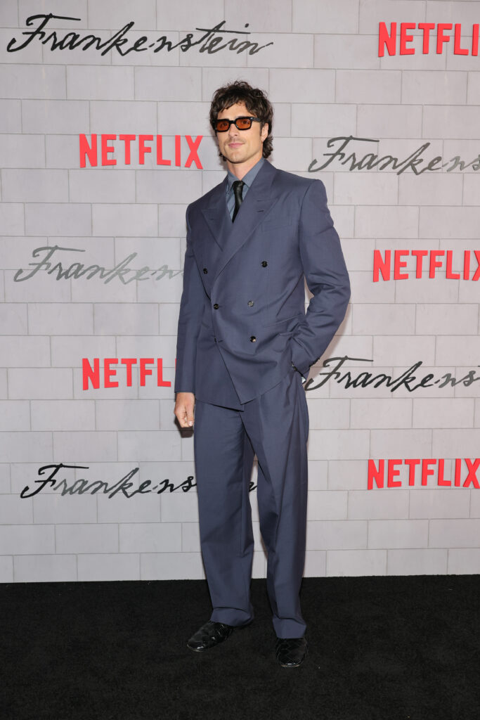 For the Netflix special screening in New York, Elordi embodied sleek sophistication. He arrived on the black carpet in a custom grey Bottega Veneta double-breasted gabardine suit, paired with shades for a touch of suave, red carpet-ready attitude.