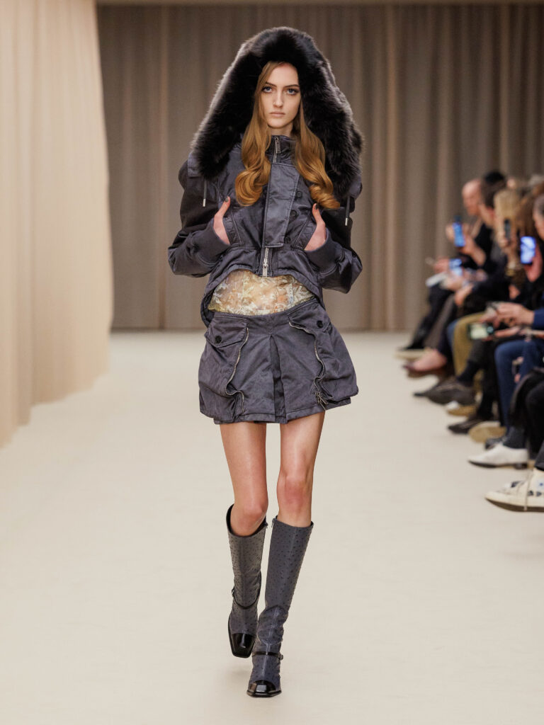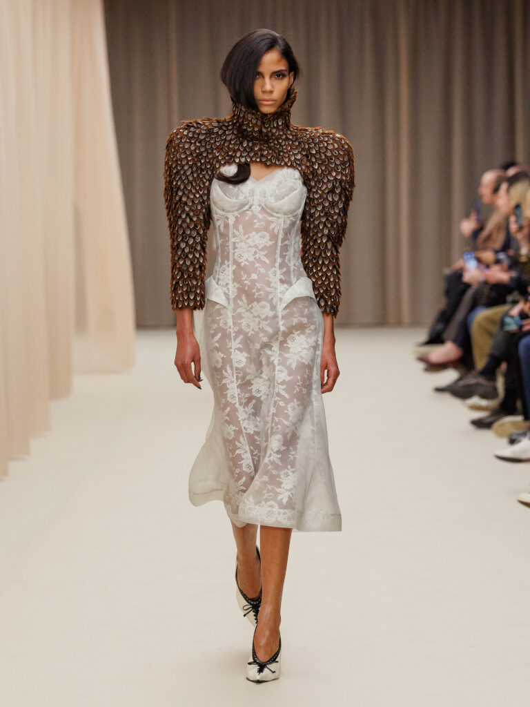 Many of the looks remain distinctly McQueen. A white dress shirt is tucked into a structured skirt, oversized details at the wrist and collar a customary statement. What appears to be knitwear is revealed to be chainmail upon a closer look. This action is what the entire collection inspires, taking a closer look. Questioning an exterior and considering a possible alternative. The impulsive movement to question and explore is granted by McGirr.