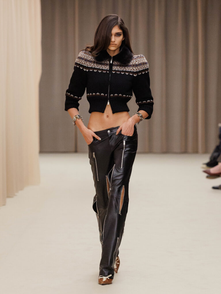 The show continues, the aesthetic coming back to the eponymous creator of the brand. Dark romance flavors the show with an erotic tone, high necklines are offset with shortly cropped skirts. The ostrich leather boots remain a welcome consistent element, the chic patent toe signalling to a chicness.