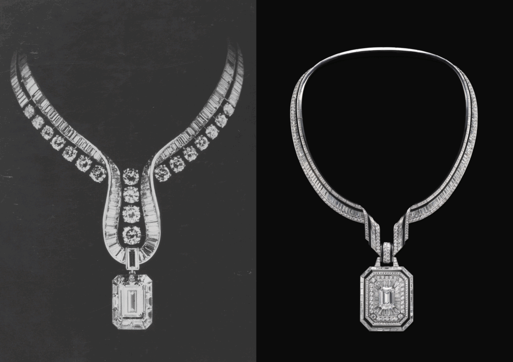 An octagonal pendant necklace — referential to the shape of Place Vendôme — is reintroduced in white gold and diamonds against black lacquer. Titled “The Address,” the piece’s focal point is a 10.01-carat emerald-cut diamond.