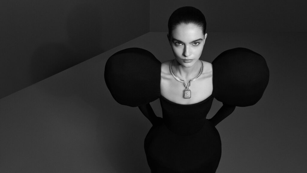 An octagonal pendant necklace — referential to the shape of Place Vendôme — is reintroduced in white gold and diamonds against black lacquer. Titled “The Address,” the piece’s focal point is a 10.01-carat emerald-cut diamond.