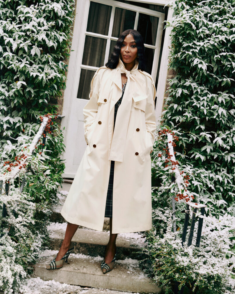 This season’s outerwear takes center stage, presenting heritage icons through renewed silhouettes and meticulous detailing. Burberry’s new-season designs, including the Heath, Trerose, and Fitzrovia trenches, reinterpret the house’s classics with modern craftsmanship. Jennifer wears the Heath quilted cape in walrus brown and hemlock beige, complete with a corduroy collar and detachable shearling trim, while Naomi appears in the Trerose trench, cut in water-resistant tundra beige with a bow-detailed collar and antique-finish hardware. Ncuti’s marsh-green trench introduces leather-wrapped B buckles and a Burberry Check lining, and Rosie’s short Fitzrovia trench, crafted in Castleford, Yorkshire, reworks tradition with a fuller skirt and domed metal buttons engraved with the house crest.
