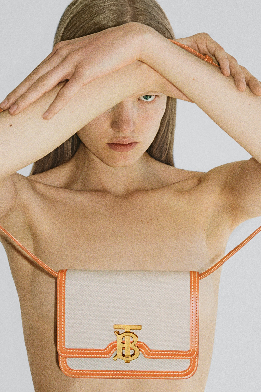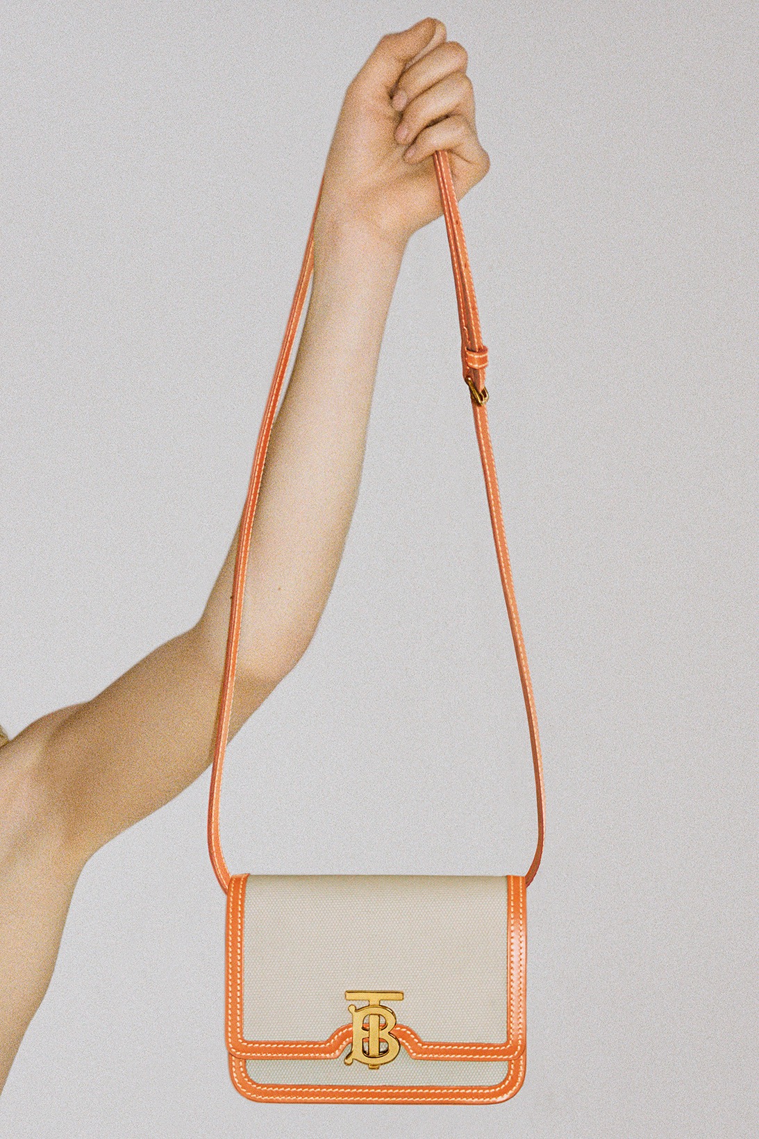 The minimal canvas exterior — accented with a bright orange, topstitched leather trim — gives the traditional TB bag a refreshing, modern twist that’s ideal for the summertime. As a finishing touch to the exclusive crossbody bag, this newest model is also adorned with the classic Thomas Burberry monogram clasp in gold-tone hardware.