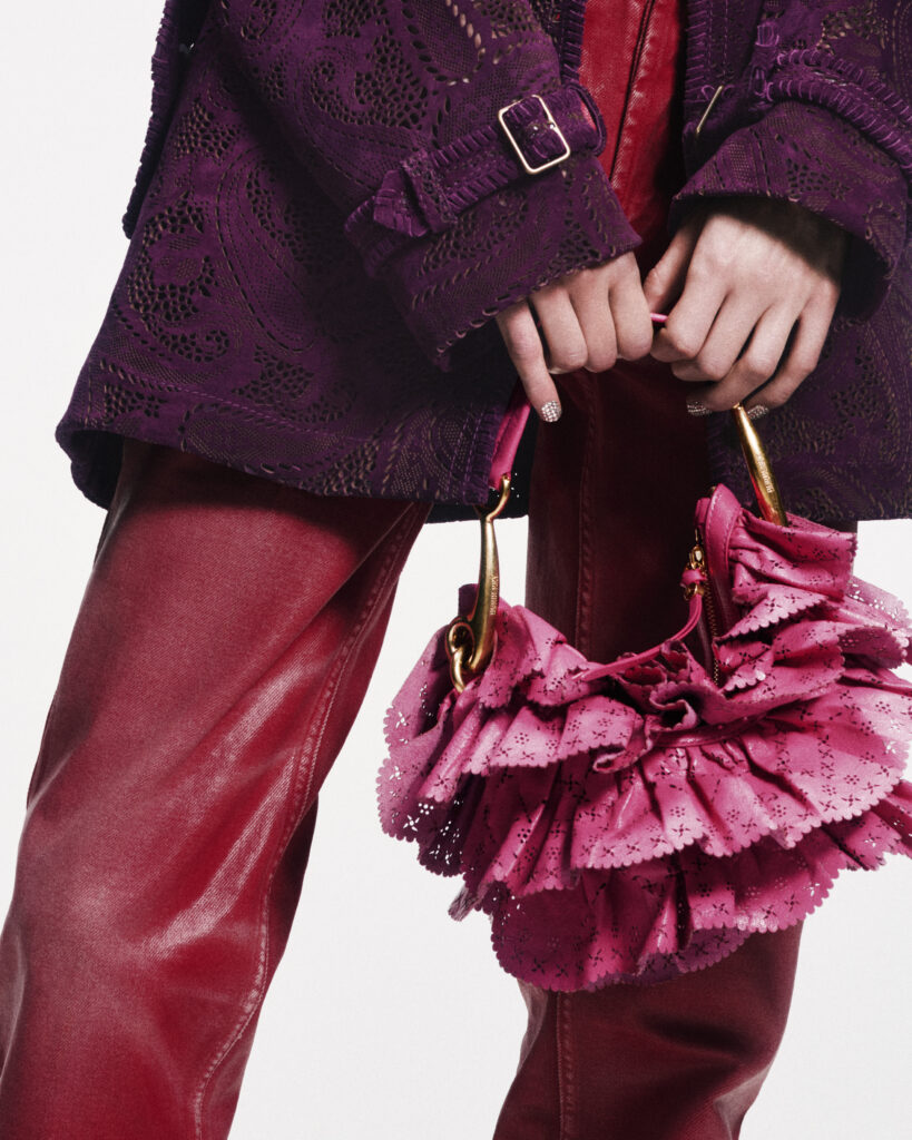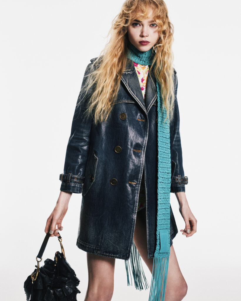 Fringe, paisley and signature plaids marry the era of the collection’s inspiration with the classicism of the British brand. Slim silhouettes and mod tailoring take the forefront with shift dresses and miniskirts at the heart of the collection. Embracing tactile and craft elements of sixties designs, mirrored tiles and crocheted leather are incorporated into garments and some dresses are hand-crocheted and embroidered. Bold tones, like rich eggplant, vibrant teal and bubblegum pink, echo the unapologetic nature of the UK music scene. For this campaign, Burberry featured none other than sixties icon, Twiggy, alongside a cast of models embracing the mod spirit.