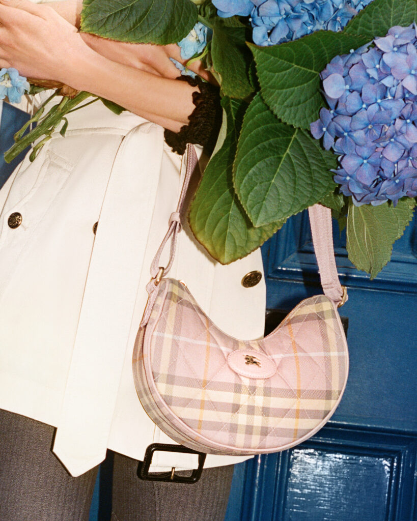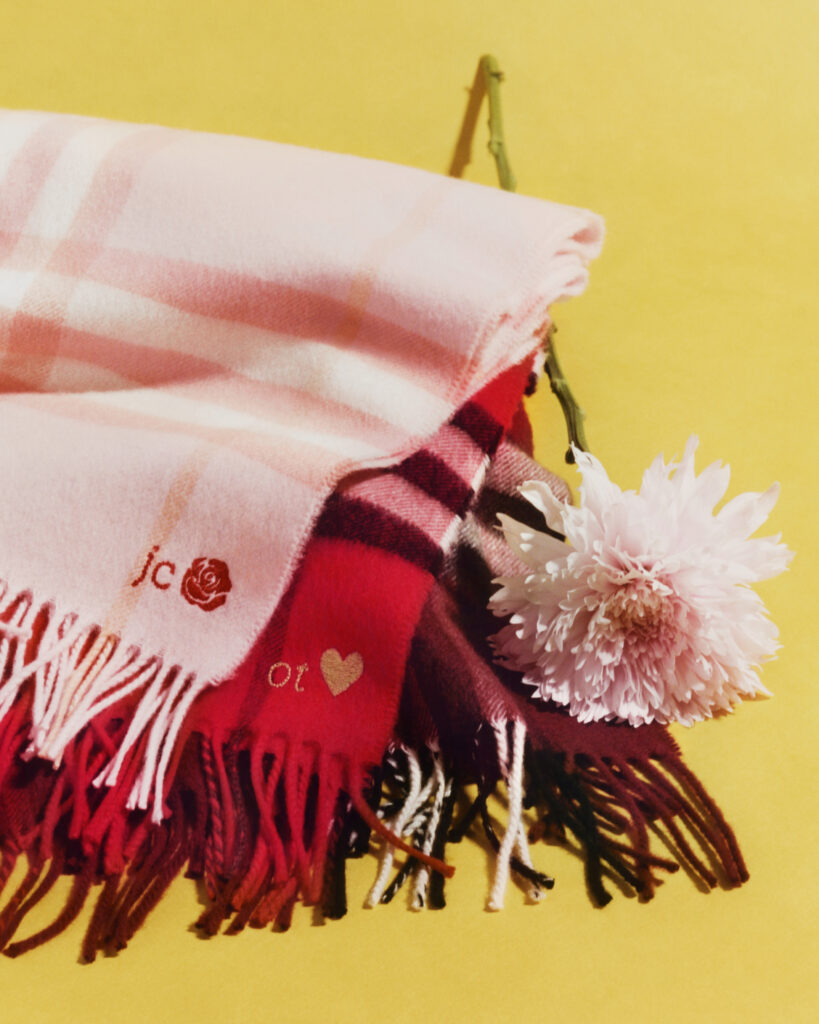 Beyond the key visuals, Burberry introduces its curated Valentine’s Day selection. The offering spans shoulder bags and compact leather wallets framed by the unmistakable Burberry Check, alongside twinkling gold earrings and bracelets, handkerchiefs, and bear plushie trinkets. More practical pieces, ranging from cream-colored trench coats to polo shirts in olive green, burgundy, and Burberry Check, round out the edit. Personalization is available on Burberry scarves through embroidered initials and new house symbols, while select sweaters and knits also support customization.