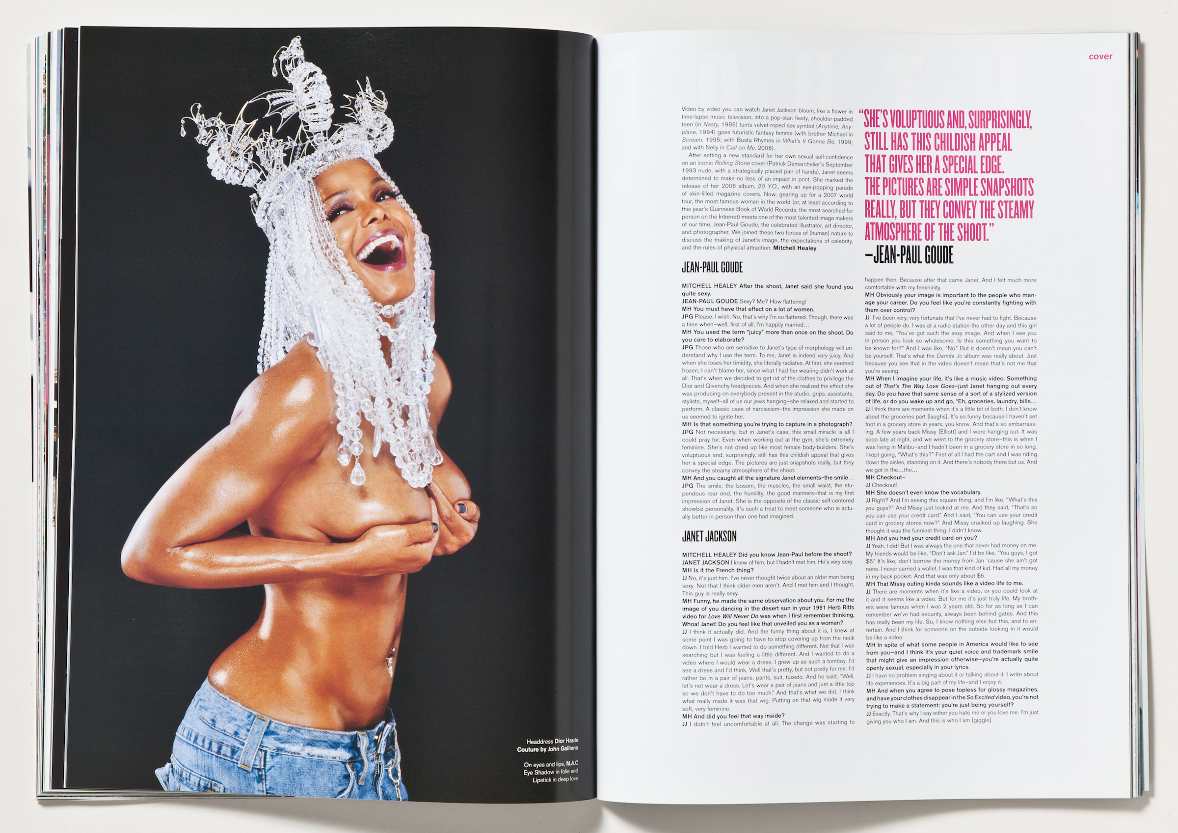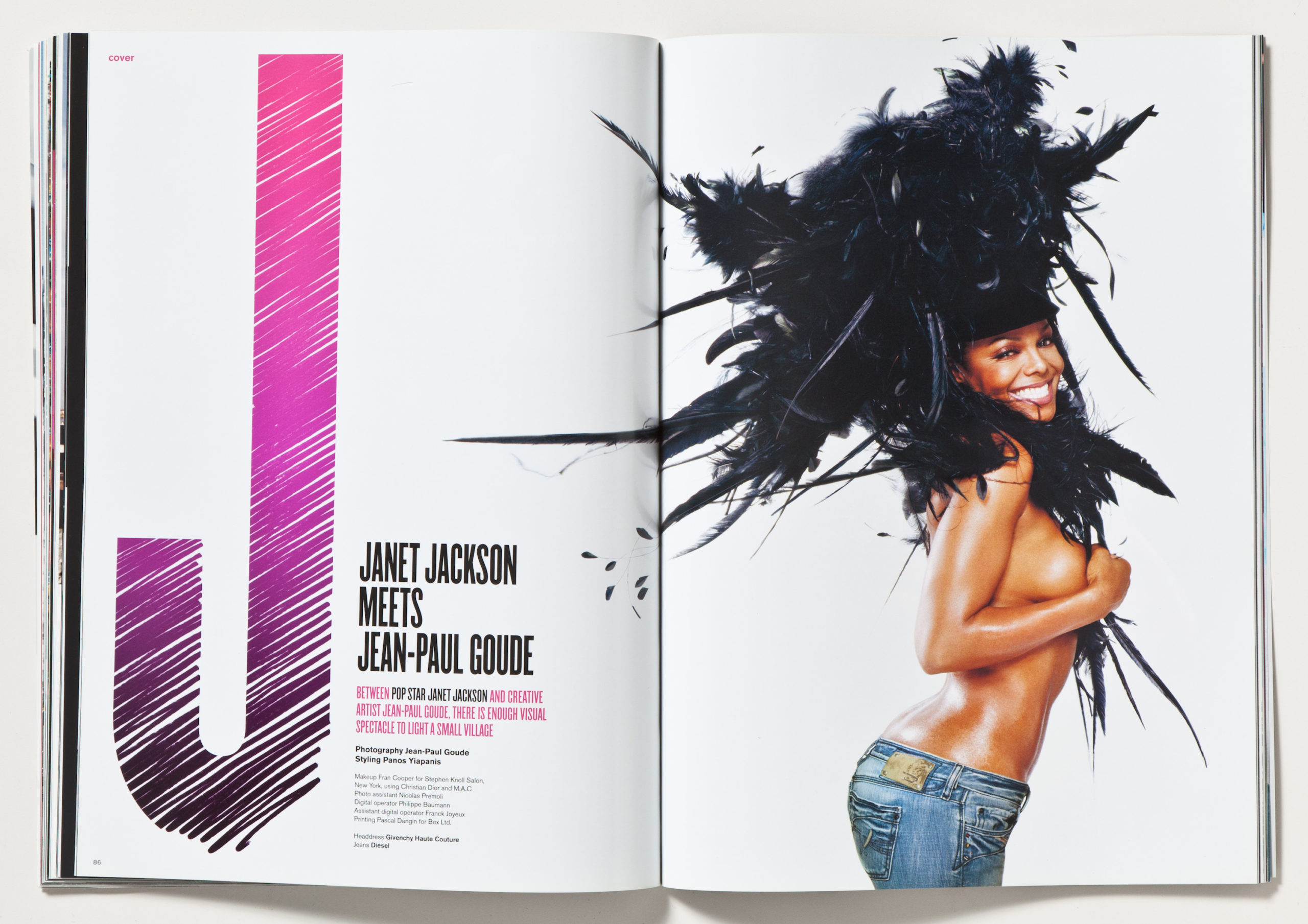 After setting a new standard for her own sexual self-confidence on an iconic Rolling Stone cover (Patrick Demarchelier’s September 1993 nude, with a strategically placed pair of hands), Janet seems determined to make no less of an impact in print. She marked the release of her 2006 album, 20 Y.O., with an eye-popping parade of skin-filled magazine covers. Now, gearing up for a 2007 world tour, the most famous woman in the world (or, at least according to this year’s Guinness Book of World Records, the most searched-for person on the Internet) meets one of the most talented image makers of our time, Jean-Paul Goude, the celebrated illustrator, art director, and photographer. We joined these two forces of (human) nature to discuss the making of Janet’s image, the expectations of celebrity, and the rules of physical attraction. –Mitchell Healey