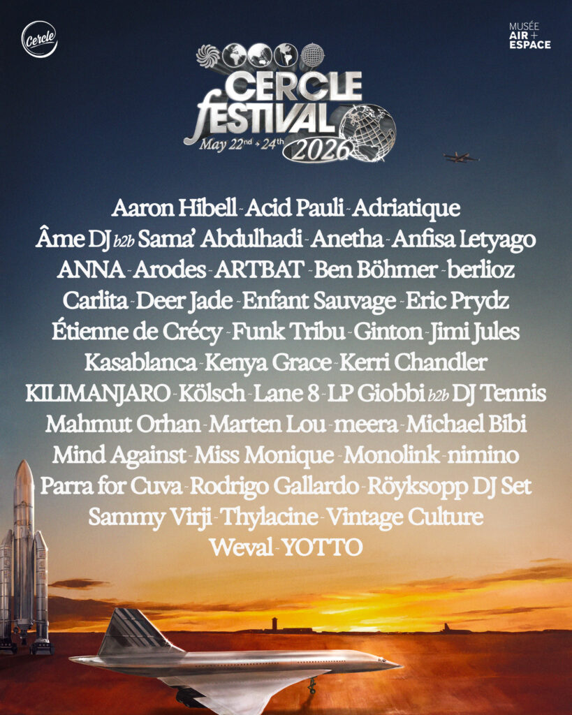 Cercle unveiled the new full lineup for the third edition of Cercle Festival, held at the National Air and Space Museum of France. Next year, from May 22 to May 24, 2026, an all-new powerhouse ensemble of artists will take the surreal tarmac stage beneath the outstretched wings of aircraft and rockets.