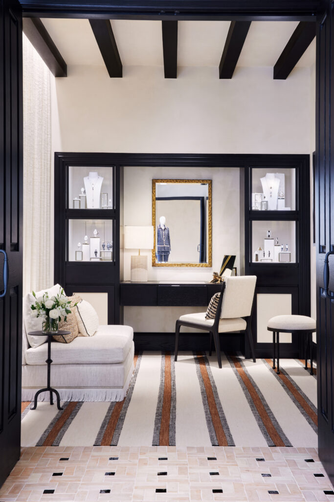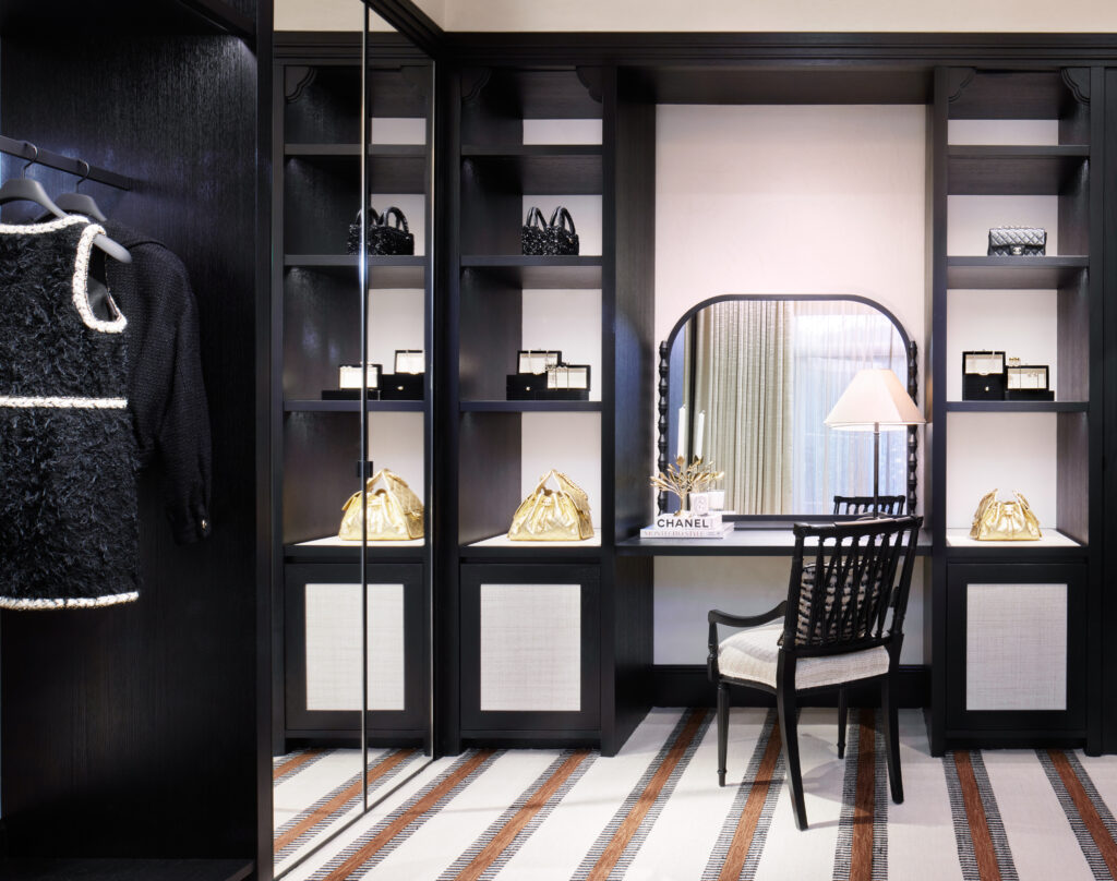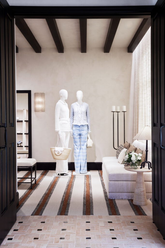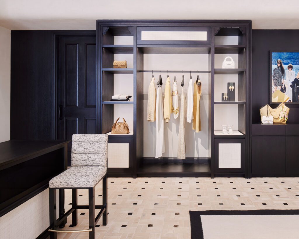 The new coastal store was conceived with Santa Barbara scenery in mind, while harmonizing fashion, watches, and fine jewelry in one single-level space. The boutique’s interior is warmed by natural light, while its high-contrast black-and-white color palette maintains the timeless spirit of Mademoiselle Chanel—dark wood shelves, neutral-toned walls, elegant patterned carpetry, and soft tweed seating. The space offers a blend of West Coast, relaxed California living with the Maison’s sophistication and irresistible grace.