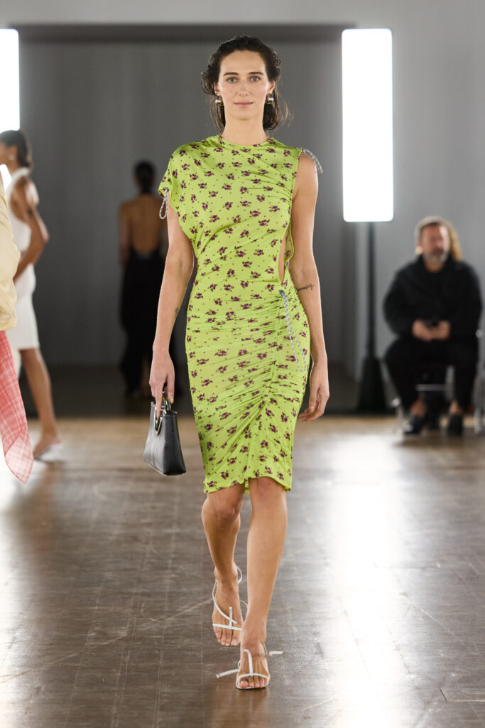 For accessories, Coperni’s Swipe bag was brought back as a series of gemstone amulets carved in quartz, tiger eye, and tourmaline. Each stone carries its own resonance. For instance, quartz for clarity and energy, tiger eye for strength and protection, and tourmaline for grounding and balance. Together, they turn the bag into a symbolic object that merges utility with spirituality.
