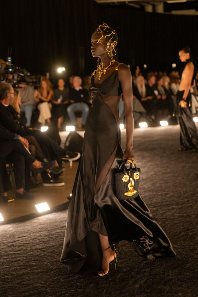 This black satin maxi dress embraces the bias cut with precision, its fluid drape enhanced by cut-outs and sheer tulle at the sides. Gold straps and buttons trail down the back. The star accessory is a black rattan-effect leather bucket bag adorned with a “melted” gilded face, recalling Dalí’s distorted clocks.