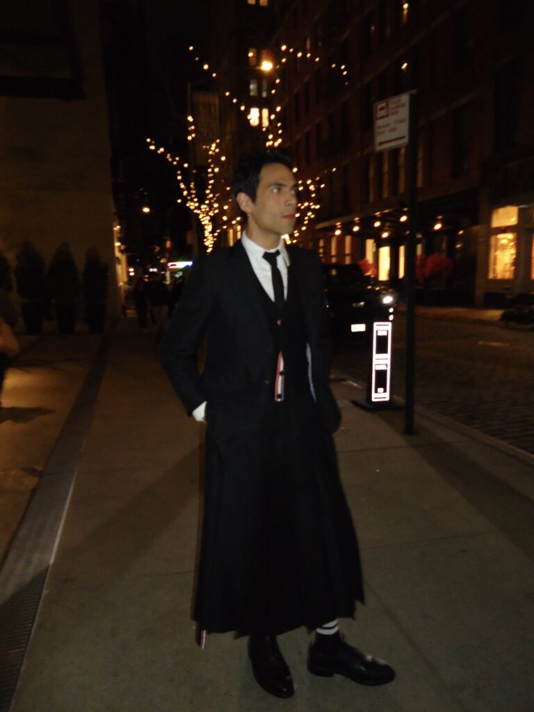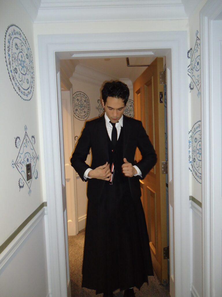 For the premiere, Calva wore a head-to-toe look by Thom Browne. A sharply tailored black blazer and matching vest formed the foundation, layered over a crisp white high-collar shirt and narrow black tie. A long pleated black skirt introduced a sense of movement, while black-and-white striped over-the-calf socks and classic black leather derby shoes grounded the look. Executed in a strict palette of black, white, and gray, the outfit was impeccably pressed and proportioned.