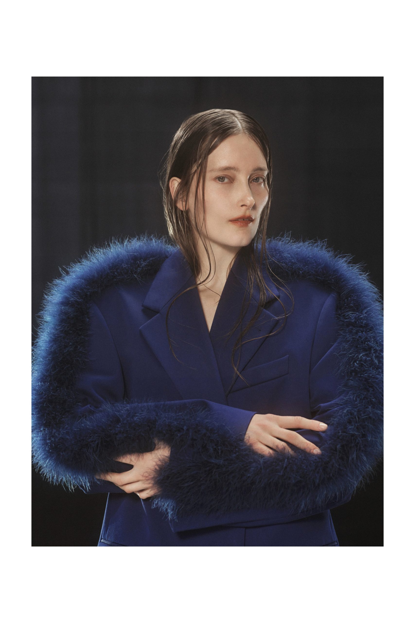 Fancy night attire meets WFH comfy casual in this wide-ranging collection. A red sequin skirt paired with a red sweater lined in bright matching feathers on a model stumbling and swaying to the beat. Red lipstick smudges and fades at the edge of her lips, reminiscent of makeup at the end of long nights kissing strangers at the club. The video cuts to a similar red sequin dress that oozes 1980s glamor; the model stares pointedly at the camera in an expression of longing for the reopening of nightlife. Electric blue and metallic silver stiletto boots add an element of “extraness” to otherwise dressed-down outfits. A simple look of a denim maxi skirt and a red rose printed sweater dances alongside a pale beige oversized powersuit, synergizing a present-meets-past mishmash of workwear.