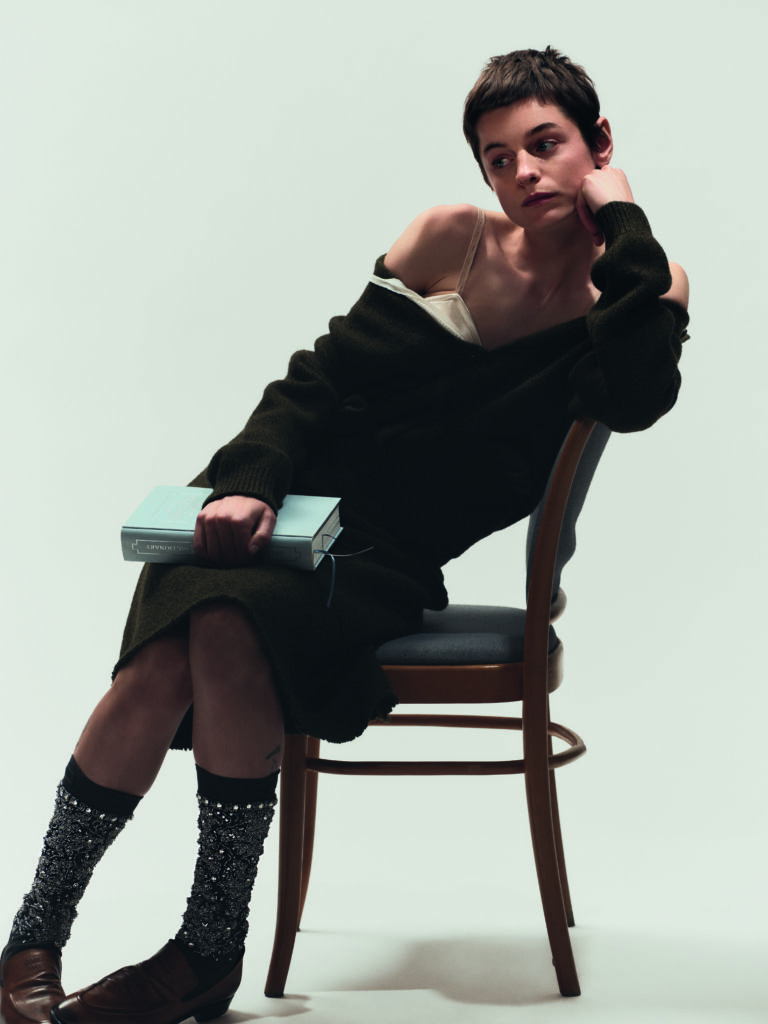 To capture this new spirit, Miu Miu turned to its global ambassador, Emma Corrin, whose distinctive presence embodies rebellion, wit, and constant transformation. The campaign, directed by Hailey Benton Gates, unfolds cinematically in a library where Corrin discovers the word “Miutine,” which leaps from the page into life and defines irreverence in motion. Corrin, a Golden Globe winner celebrated for their portrayal of Princess Diana in The Crown.