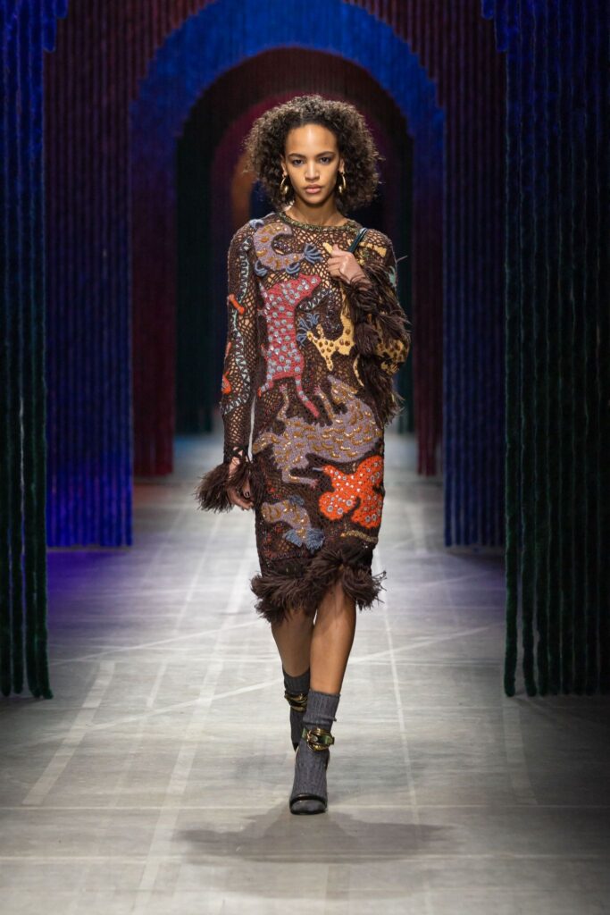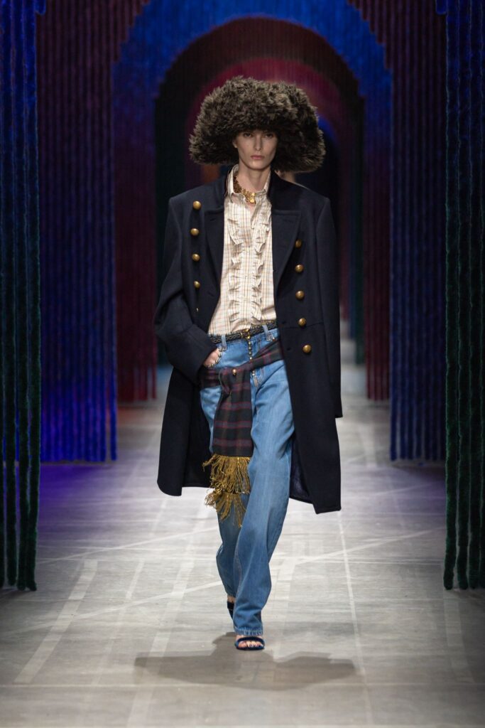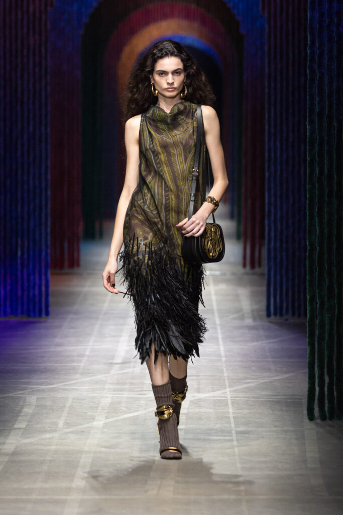 Dense embroideries of fantastical animals and golden fringes animated the runway. Accessories created in collaboration with Birkenstock showcased sturdy boots to suede mules, alongside softly structured handbags, and embroidered pouches. The show unfolded to a live medley by BLUEM, who performed LUNEDI, DOMENICA, GIOVEDI, IL CAVALLO, and CHIAl.