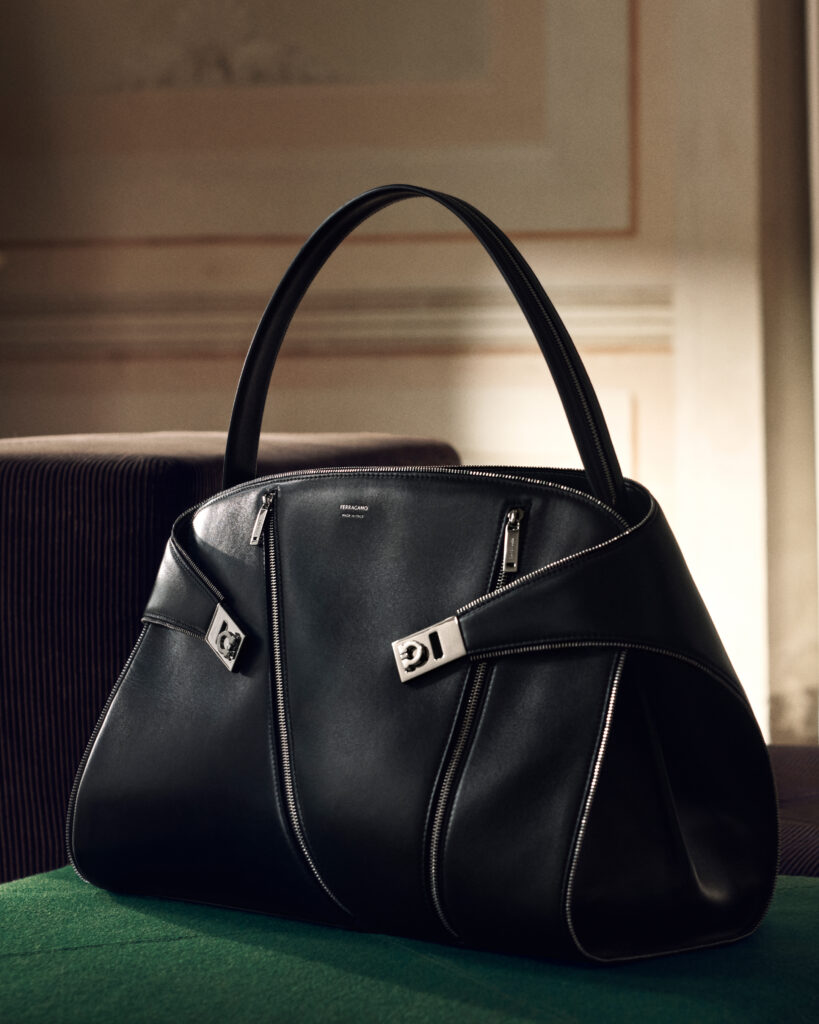 Archival products are seen revitalized. The bow-bedecked Vara heel is transformed with gloss and elevated, while the menswear classic Tramezza shoes breathe a new contemporary life, still enduring Ferragamo’s savoir-faire. Even the house’s latest pieces, the Hug Bag and the Soft Bag, appear reimagined, printed with palms or fantastically filled with fur.