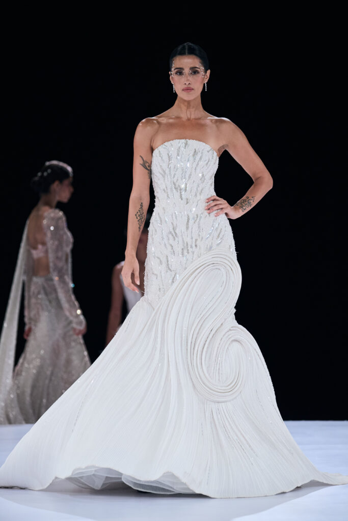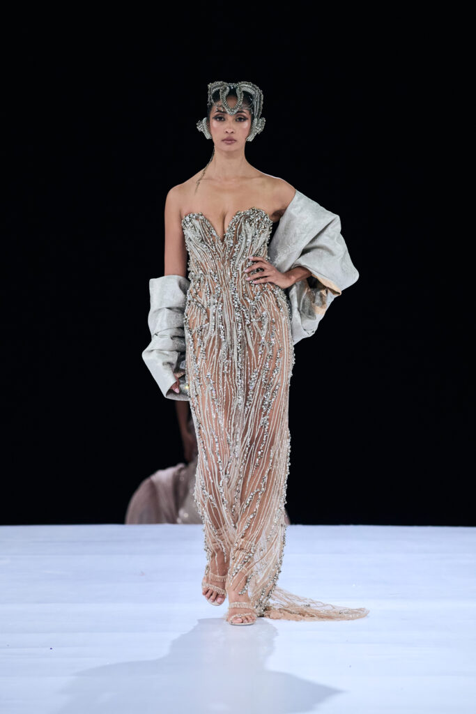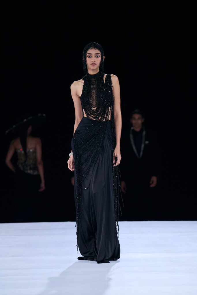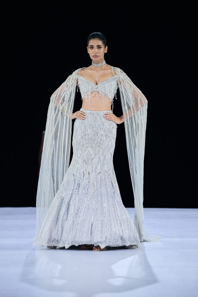 Inspired by the theory that two particles remain eternally connected, Gupta translated this cosmic idea into couture that mirrored the emotional synchronicity of marriage rituals. The show opened with his signature cocktail and reception wear, including saree gowns, sculpted lehengas, and architectural dresses influenced by Art Nouveau and glacial landscapes.