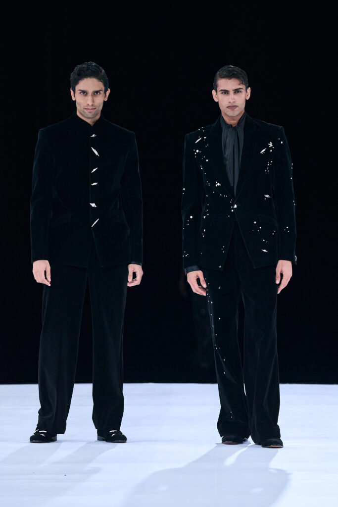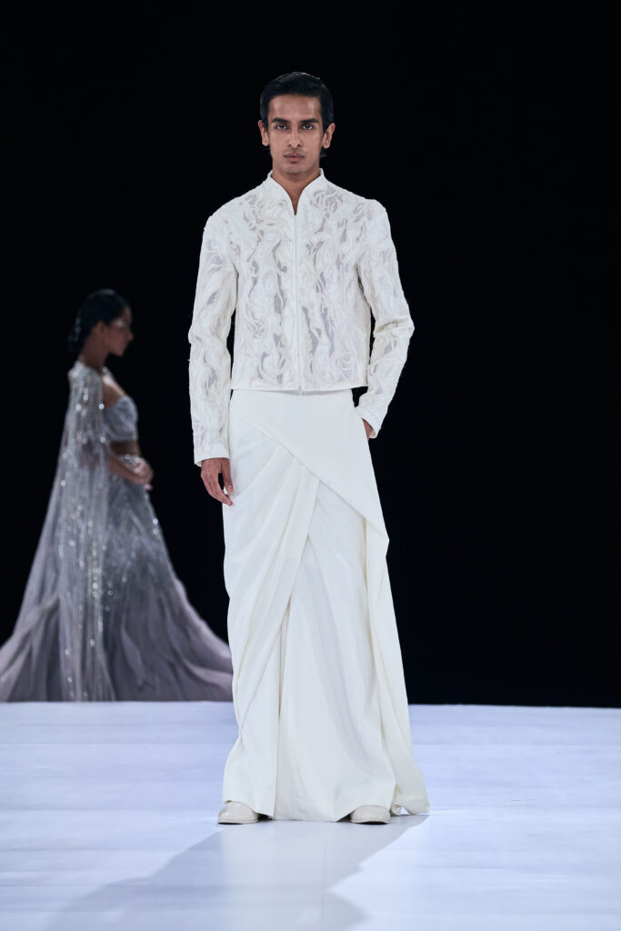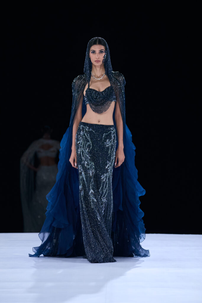 The collection’s colors ranged from soft blush and gold to graphite, black, and electric blue, each shade elevated by exceptional craftsmanship. Banarasi brocades woven over 200 days, crystal webs, hand-cut florals, Chantilly lace reimagined into modern forms, and mother-of-pearl inlays with an heirloom touch transitioned naturally into the menswear. Here, sharp tailoring for the modern groom took shape in classic tuxedos, bandhgalas, and jackets adorned with safety-pin lapels, planetary beadwork, and metallic accents in obsidian, graphite, and midnight navy.