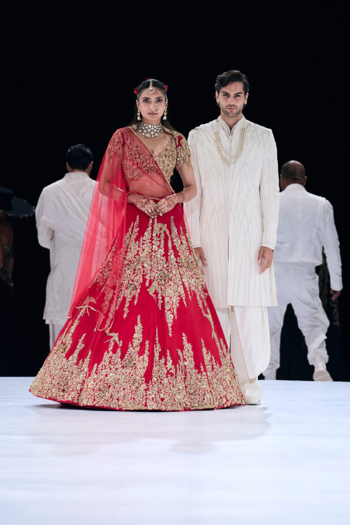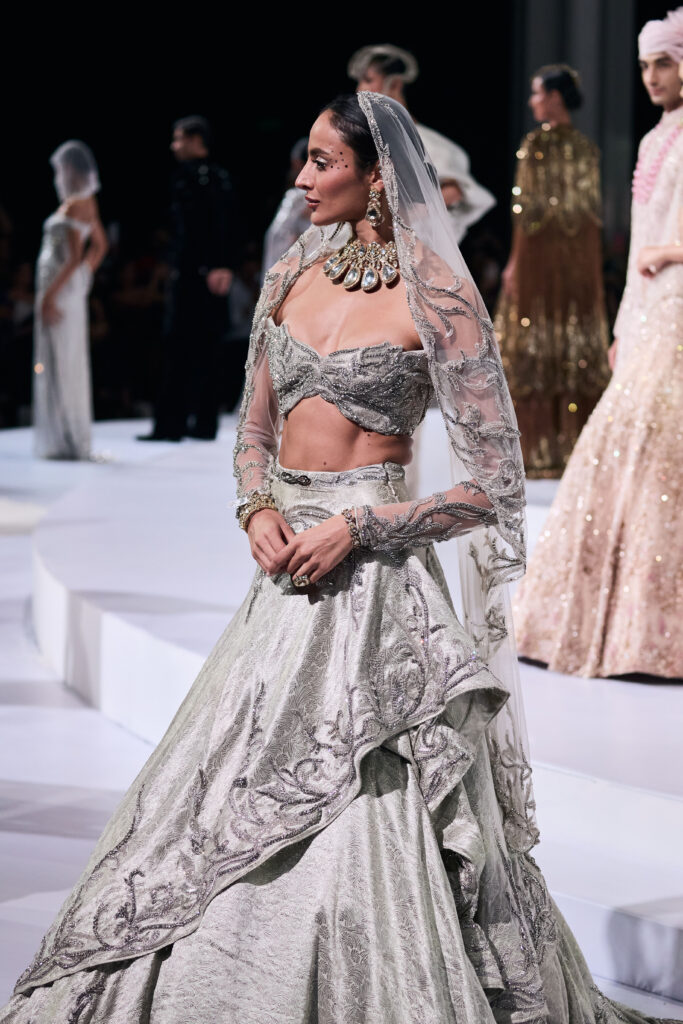 The crescendo came in a ten-look bridal segment, Gupta’s most ambitious yet. Vermilion red lehengas shimmered under 60,000 bugle beads and zardozi florals, pastel gowns in blush and sage carried ethereal ombré beadwork, and the house’s iconic cascading lehenga silhouette was reborn in gilded Banarasi brocade. Cathedral-style veils trailed like architectural halos, designed to frame rather than hide the bride.