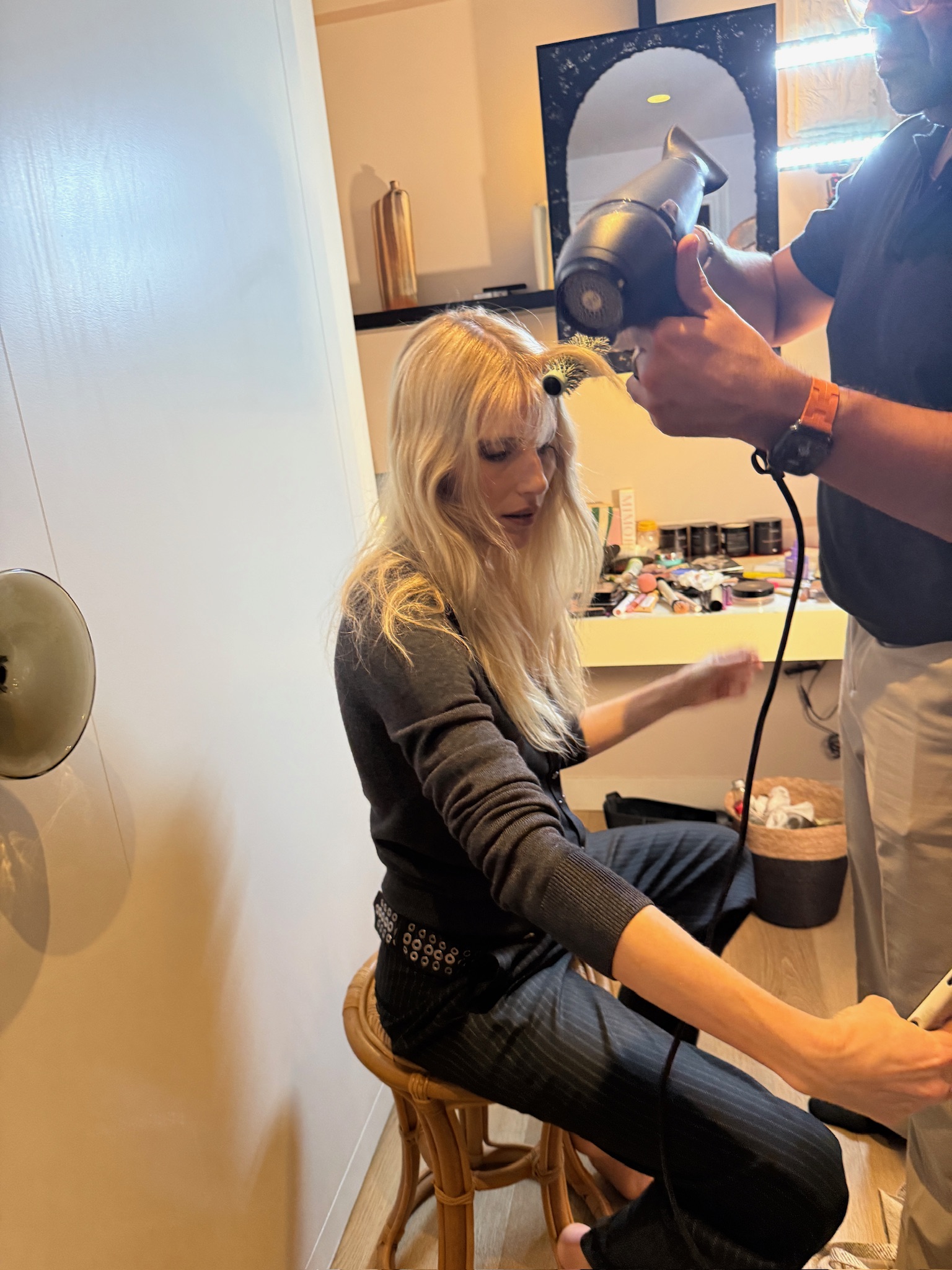 “Checking for any last minute touch ups on my hair + makeup before the flash photography does.”