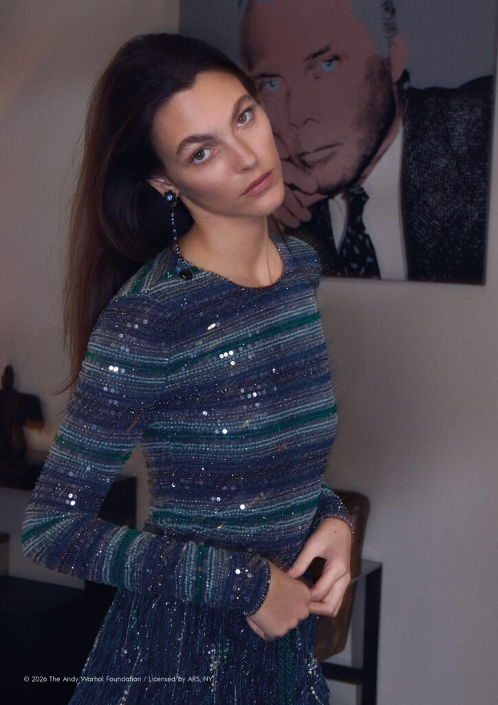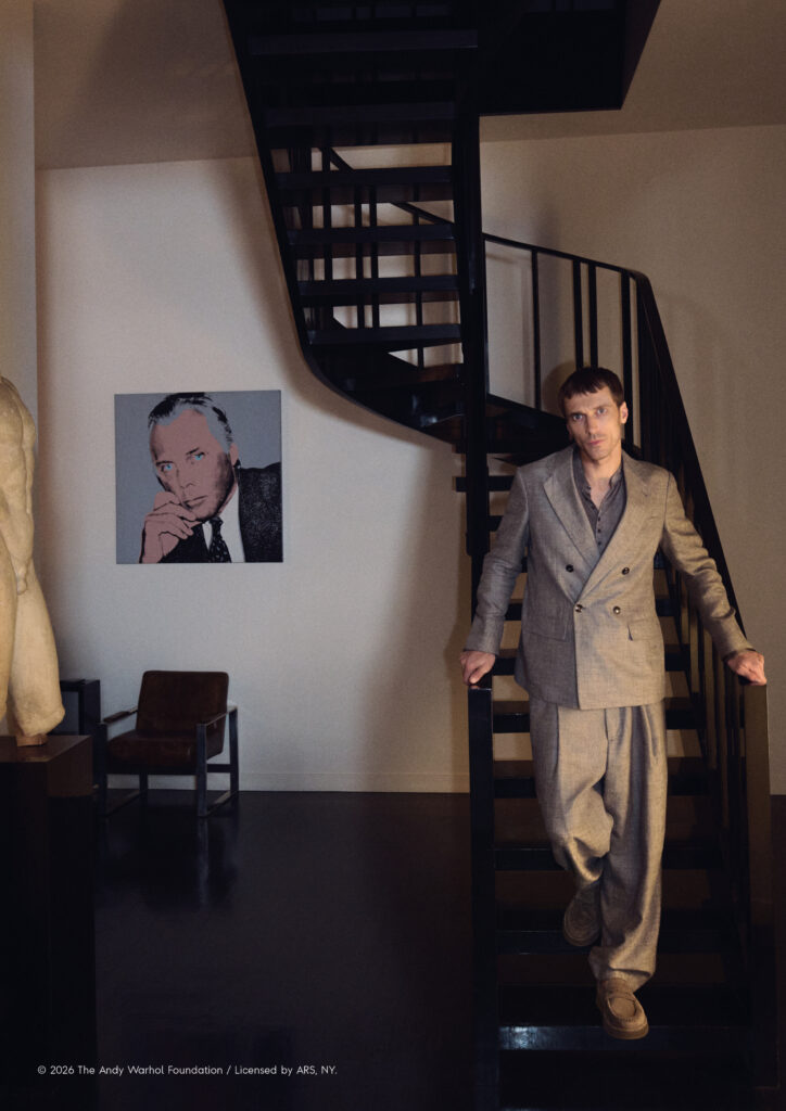 Shot by Oliver Hadlee Pearch, the campaign offers an intimate glimpse into Armani’s personal collection of design pieces, sculptures, and artworks. Clément Chabernaud appears standing before the residence’s swirling black metal staircase—leading to Armani’s favorite third-floor study—flanked by a marble Roman torso. Vittoria Ceretti also fronts the campaign, posing against works by Andy Warhol, Gary, Francesco Clemente, and Antonio Lopez.