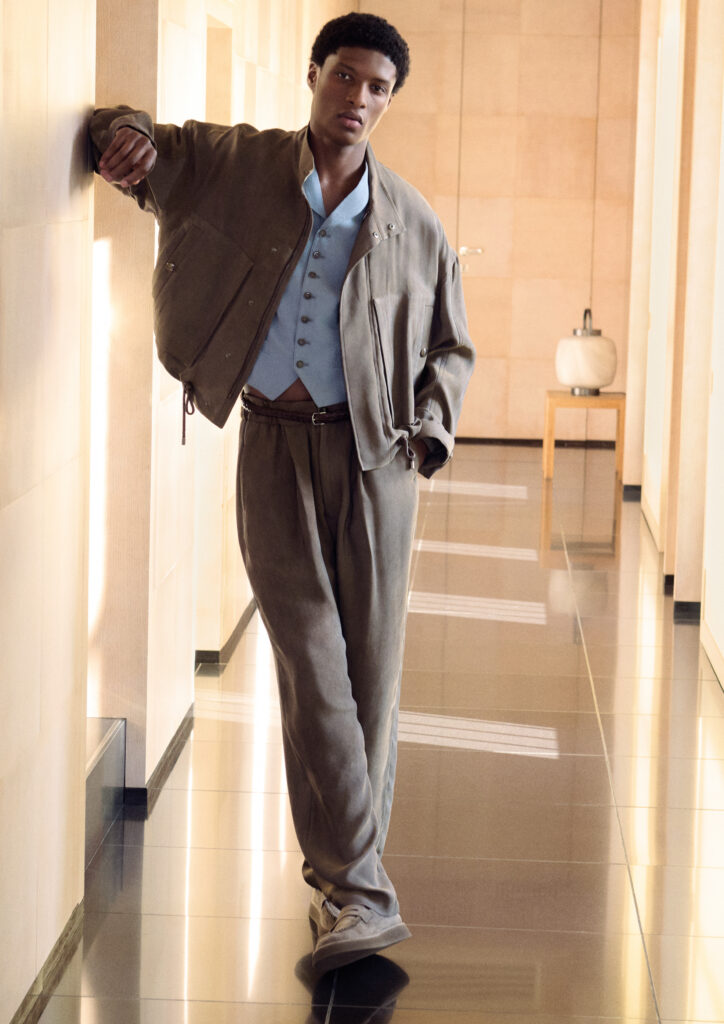 Elsewhere, Aboubakar Conte and Zhaoyi Fan are photographed throughout the home, while Greta Hofer appears in the Giorgio Armani Eyewear images, shot both indoors and in the garden. Set against warmly lit lamps, patterned wallpapers, and layered interiors, the structured suits, flowing dresses, pullovers, and shirts feel animated, held in quiet dialogue with the designer’s meticulously composed residence.