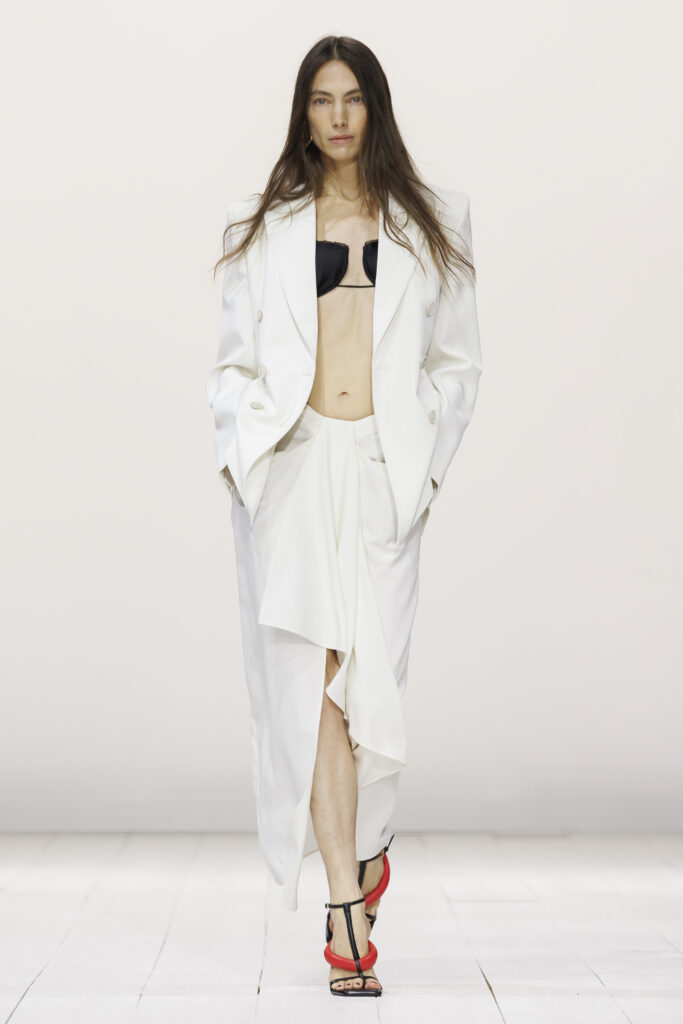 Burton simultaneously explored transparency, not just in the fabric choice, but also in its intent. Delicate lace, sheer tulle, and featherweight chiffon revealed the body without objectifying it, while reclaiming the act of sensuality. Accessories were pared back, with sculpted cuffs, ribbon-thin belts, and barely there heels.