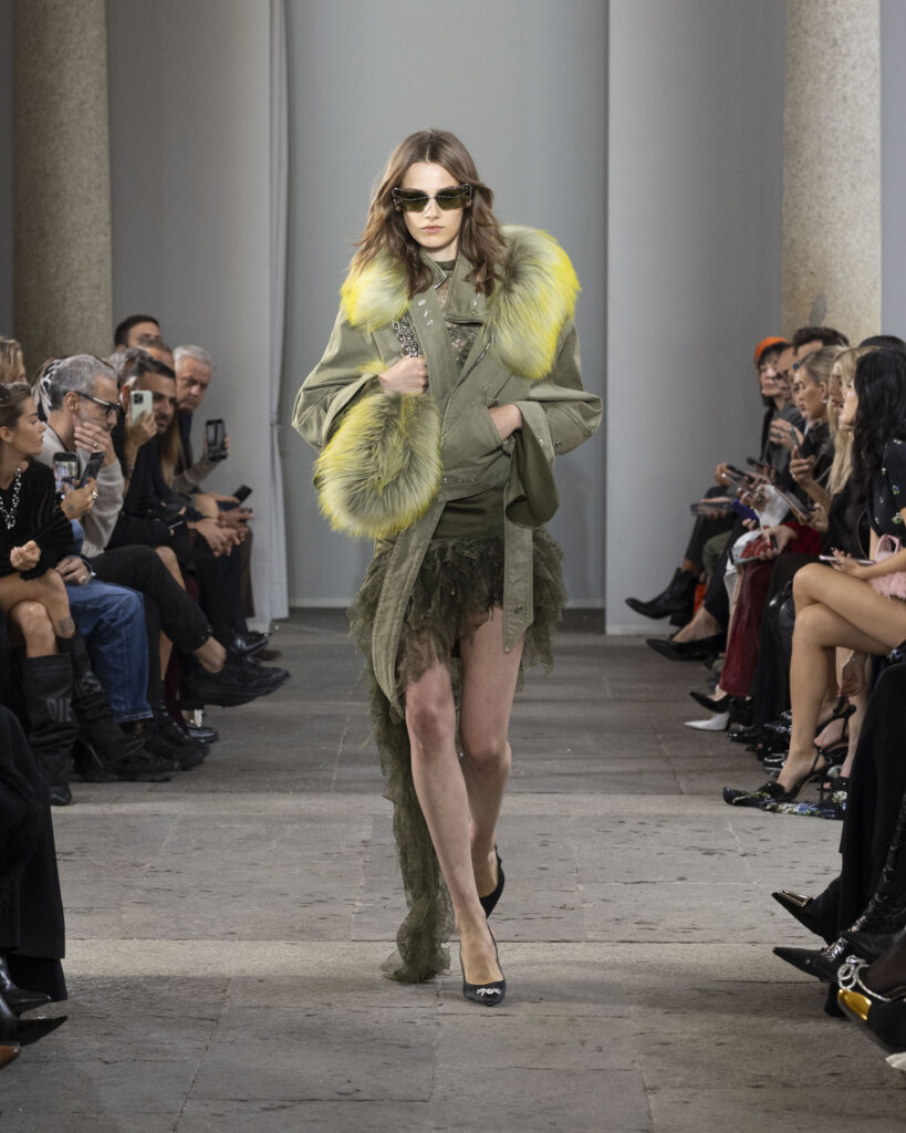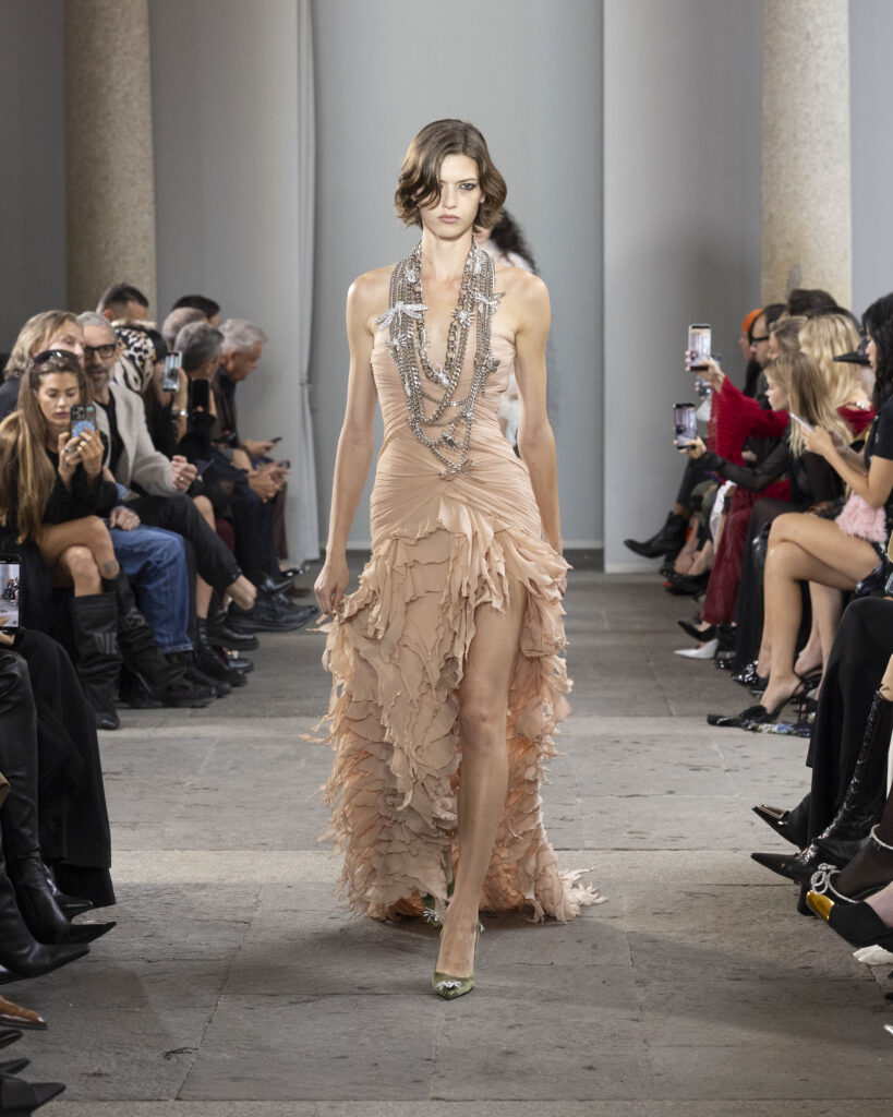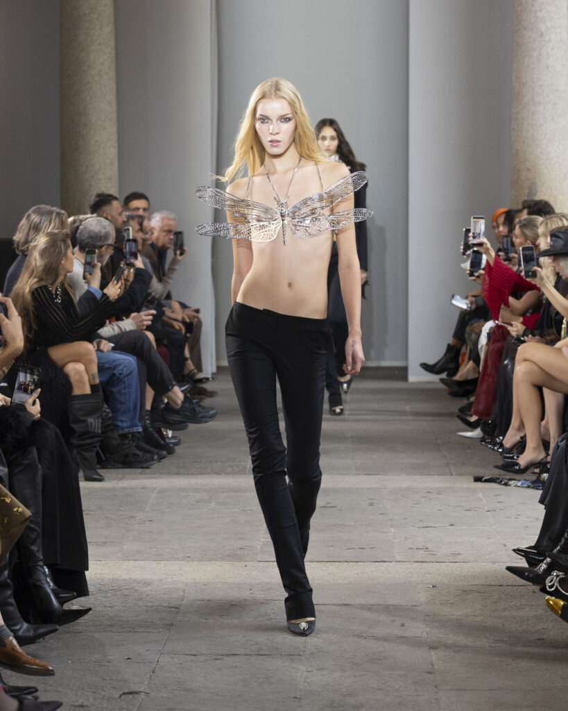 The recurring motif of the collection is the butterfly, a longstanding emblem of Blumarine, now paired with the dragonfly as this season’s symbol. Both creatures embody transformation and duality, appearing across embroideries, prints, and silhouettes. Their presence reinforces the dialogue between metamorphosis and identity. Just as the butterfly and dragonfly transform, the collection about the fluid states of becoming, where change itself becomes a form of allure.
