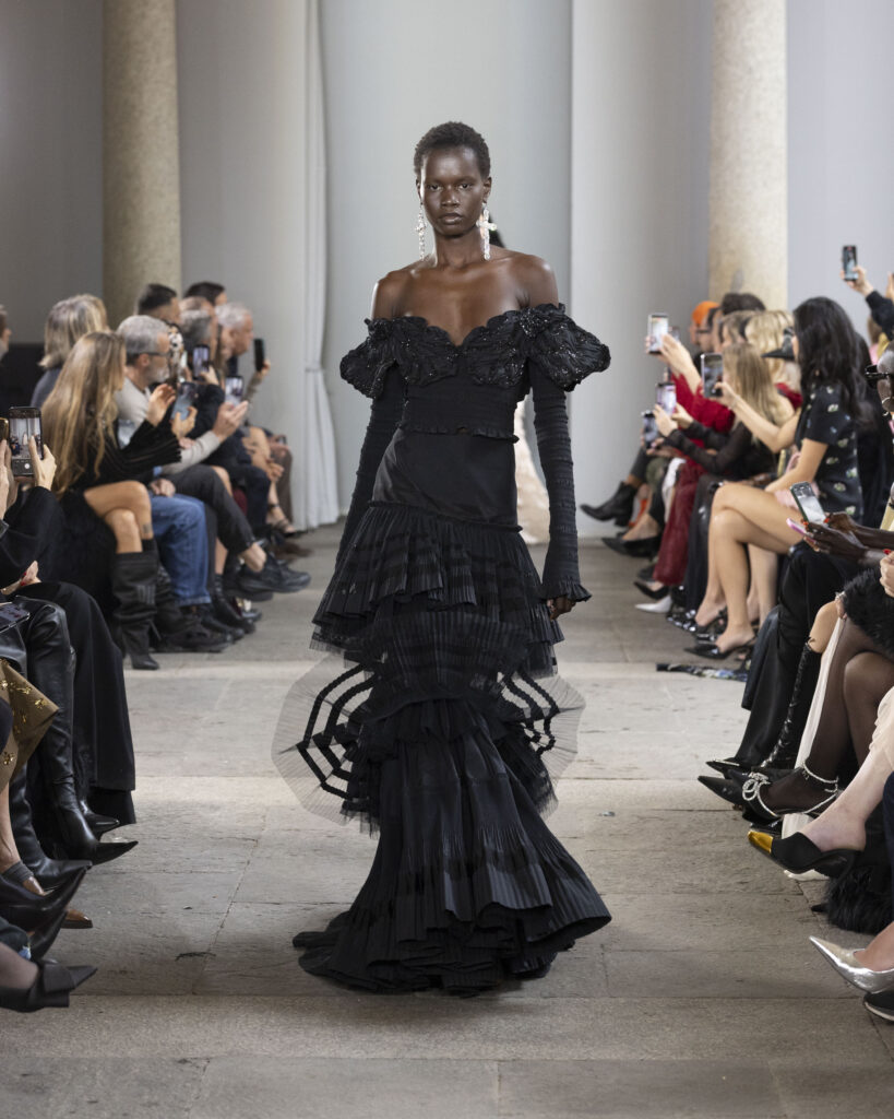 Tiered georgette dresses flow dramatically, while satin gowns shimmer with butterfly embroideries edged in rebrodé lace and disrupted by frayed reconstruction. Elastic tulle contracts into spiderweb-like forms, and crinkled georgette blouses show butterflies morphing into leopard dots. Camouflage graphics spread across plumetis tiers embroidered with macramé, while taffeta and lace skirts over plissé soleil build clouds of motion. A black gown stands out with a beaded bodice tracing an insect’s spine above a tulle skirt blooming with butterflies, dragonflies, and spiders. Tailoring carries the same gothic spirit, with jackets morphed into wing-like panels and lace hidden beneath trouser waistbands.