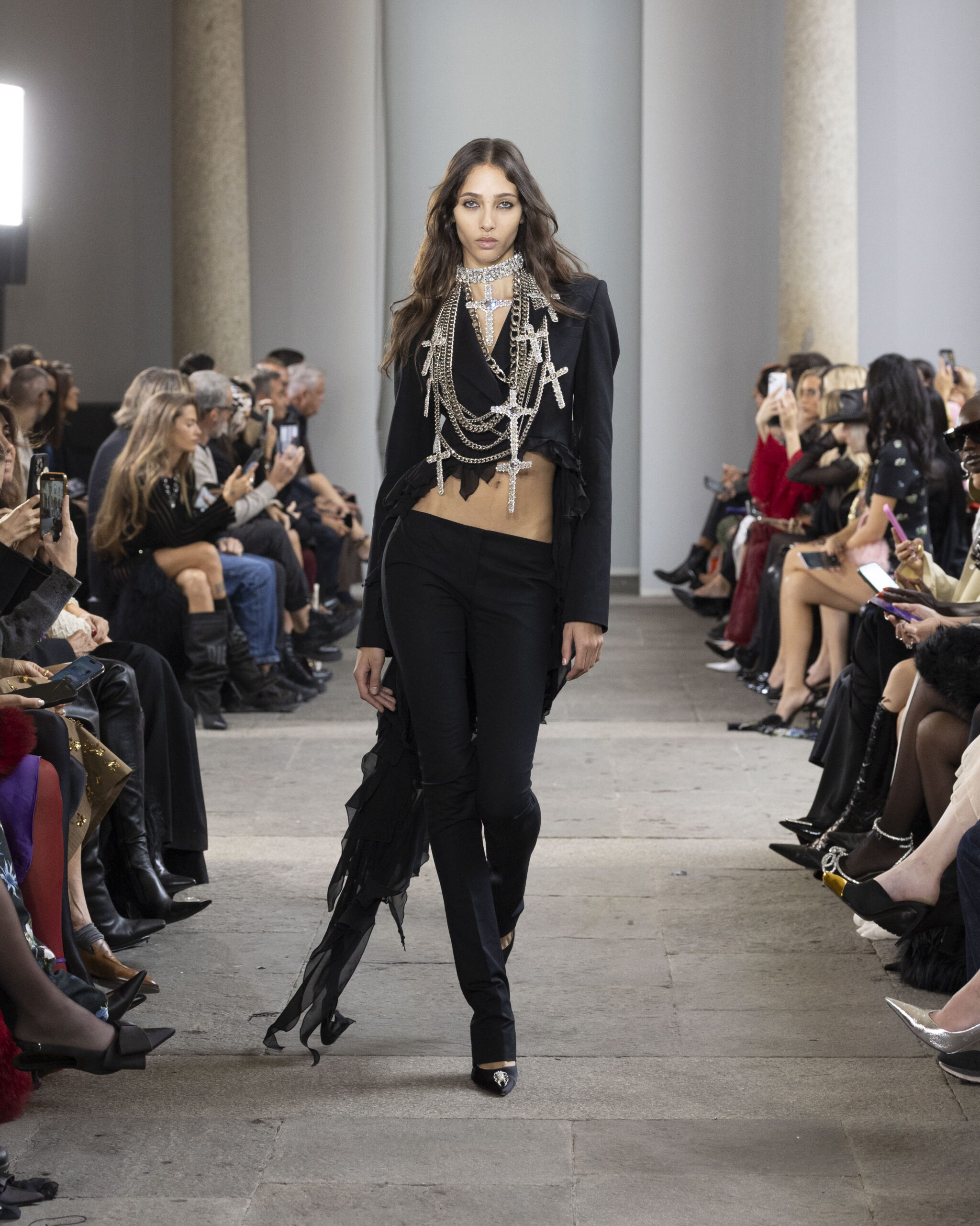 Accessories and hardware deepen the darkness with rhinestone crosses glistening across chokers, earrings, and body charms, often joined by dragonflies and spiders. Metal bras, dragonfly breastplates, hammered cuffs, and armlets underscore Koma’s magnetic preference for metallics as a second skin. Sunglasses with butterfly-shaped lenses, adorned with studs or cross pendants, sharpen the collection’s edge of allure.
