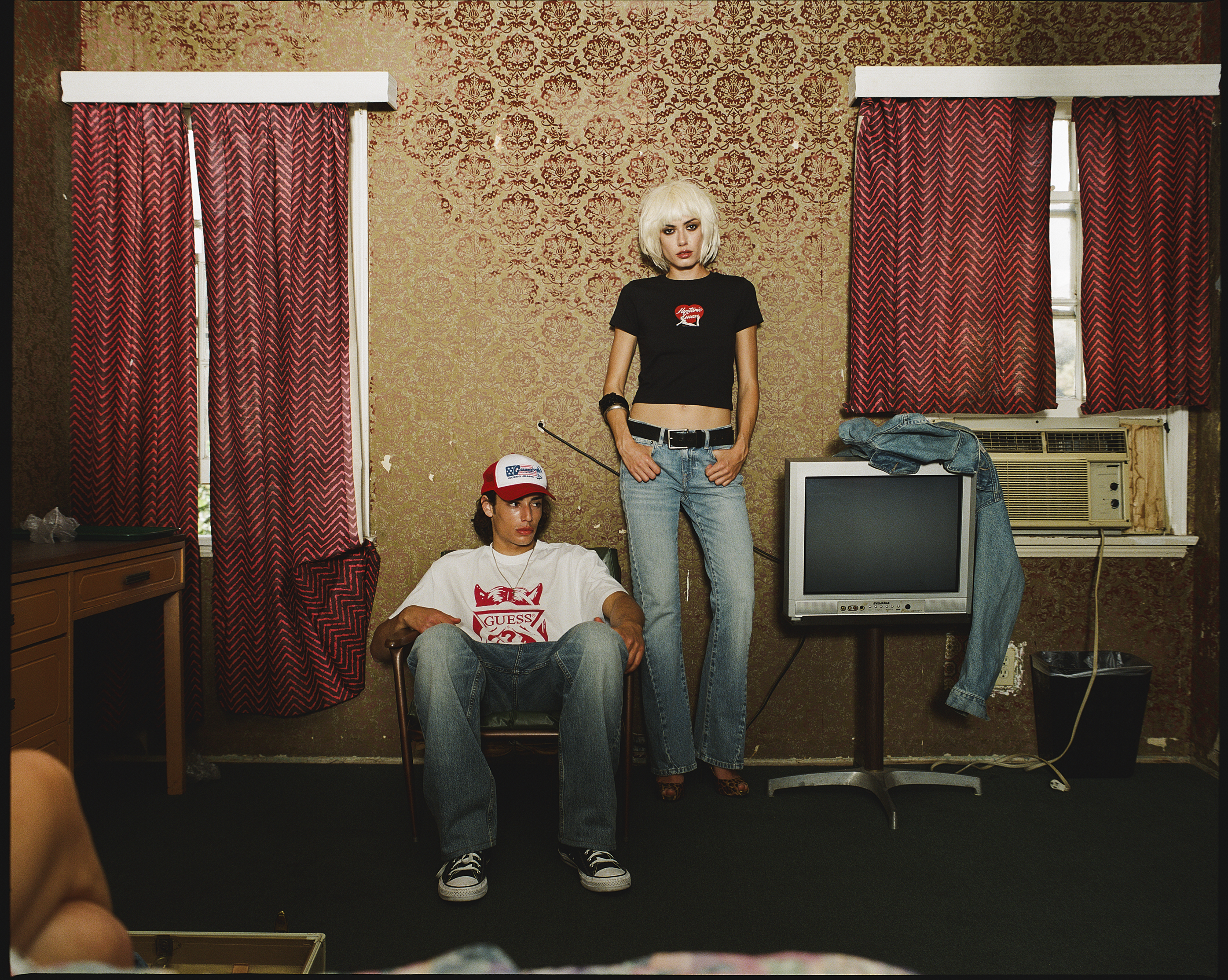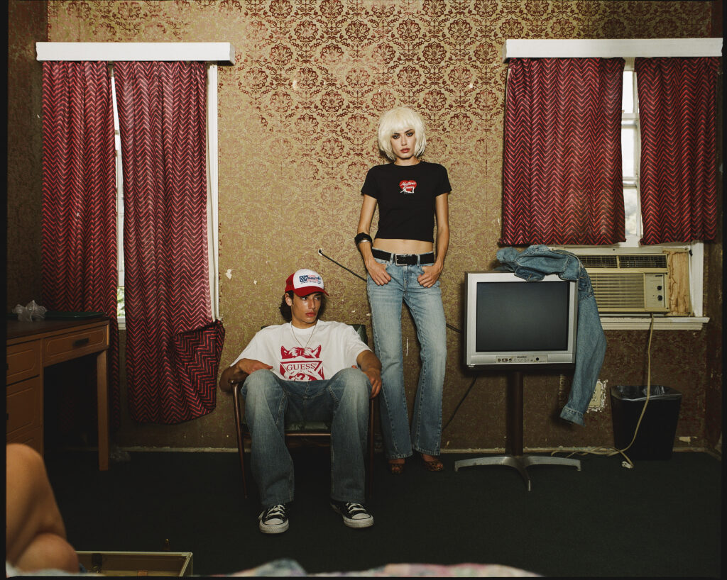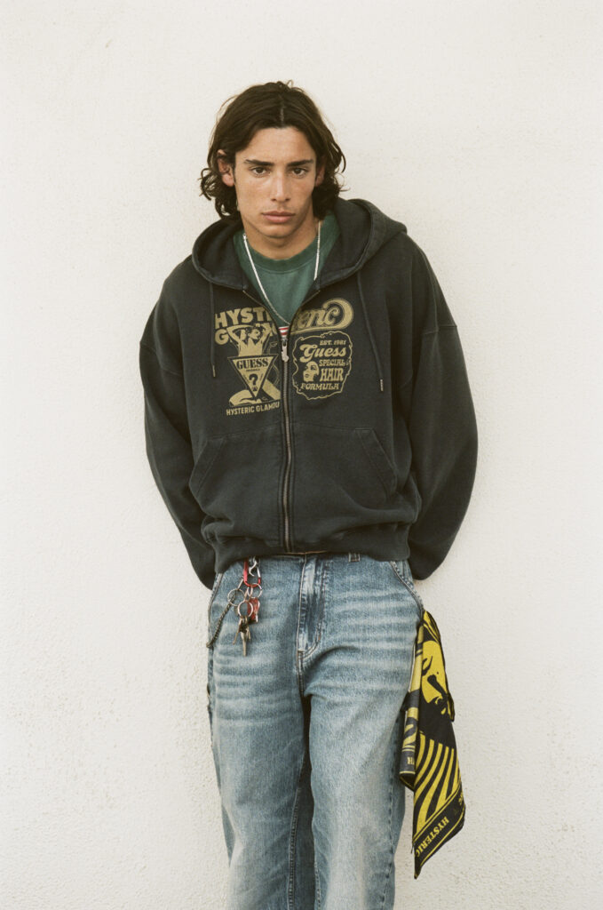 Shot at a Los Angeles motel, the campaign moved between a room interior, a constructed studio, and the exterior under West Coast light. The collection followed the same approach. Vintage GUESS imagery was layered with Hysteric Glamour motifs, labels were stitched across garments, and denim was treated with embossing and laser techniques. Underneath, textured striped fabrics inspired by Venice Beach added another layer. That approach came directly from Hysteric Glamour’s history. Founded in 1984 by Nobuhiko Kitamura, the brand developed out of Harajuku with a perspective shaped by American culture but never limited to it. Its references to rock, pop, and underground scenes were always about interpretation. Over time, that carried into collaborations with Sonic Youth, the Andy Warhol Foundation, and later Supreme.
