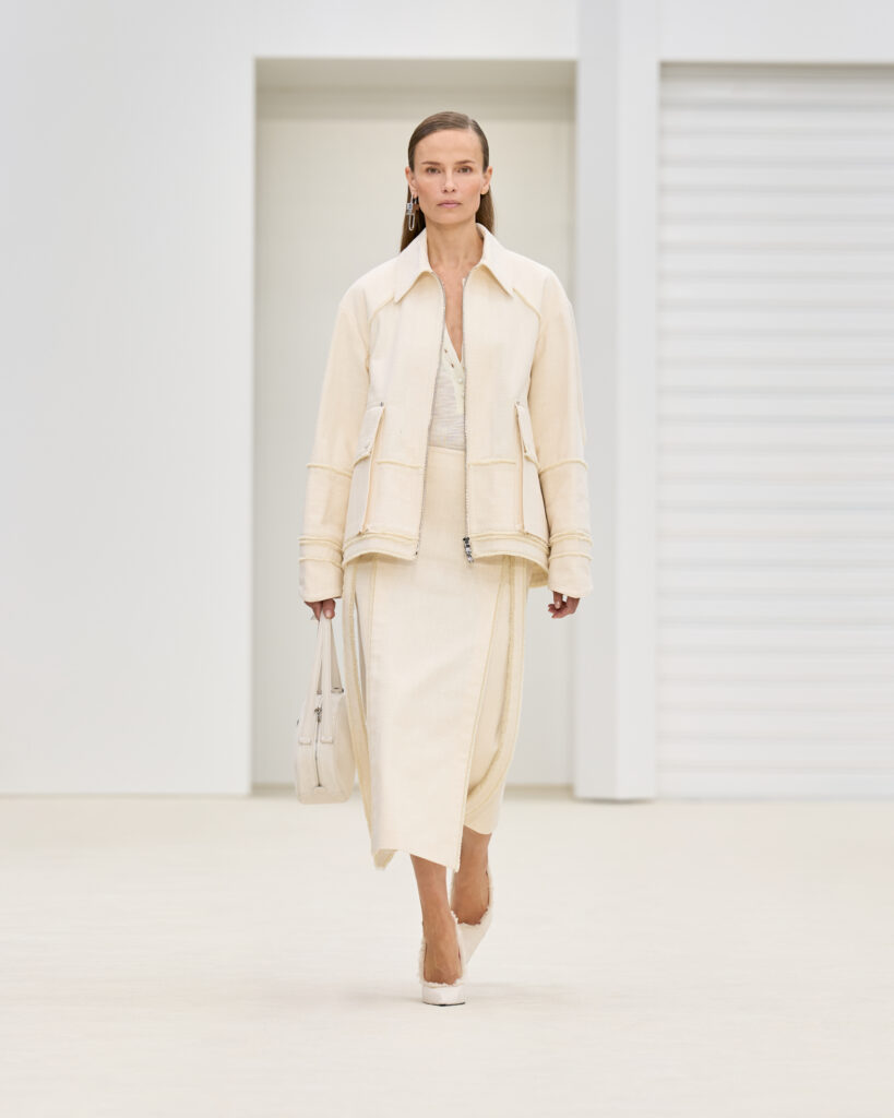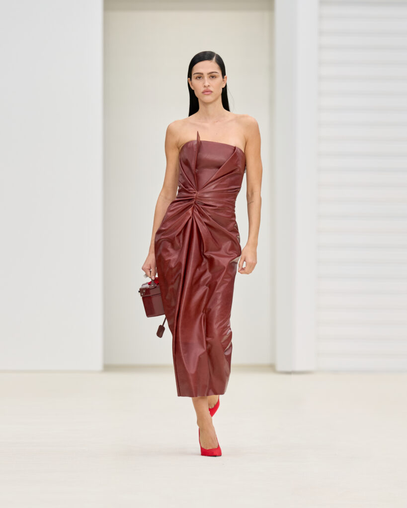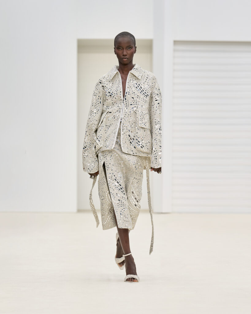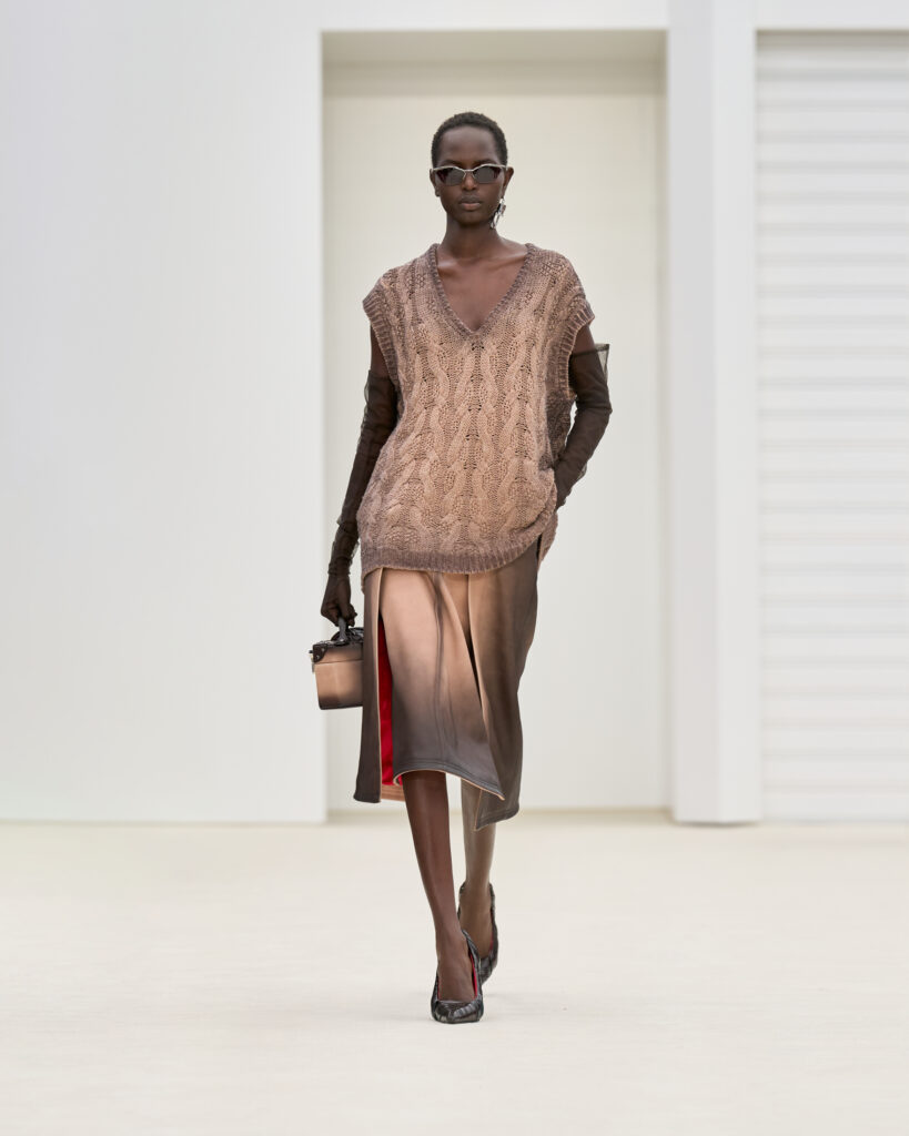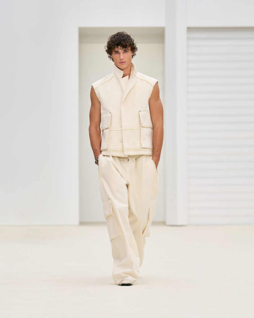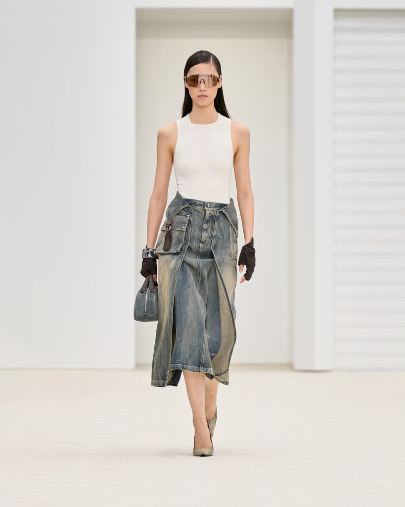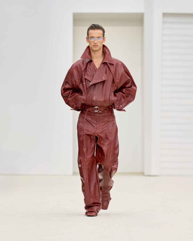 The runway narrative begun with elongated dresses and loose tailoring, flowing shirts, and cargo pants. It intensifies with sponged leathers, acid-etched denim, and airbrushed knits, before concluding in sculptural fluidity with a silvery shimmer. The collection utilizes silk canvas, tussah silk, cashmere gauze, silk moiré, Nappa, and denim, materials celebrated for the richness of their weave and finish. Creative Director Rocco Iannone opted for lean vertical silhouettes and enveloping volumes that magnify movement, while precise cuts allow tactility to take center stage. The palette is grounded in Ferrari’s signature red and complemented by the natural tones of each fabric.