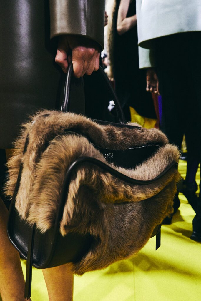 And play touches every corner of this collection. Wool-y yarn tails trail behind and up the bodice of an otherwise simple violet dress, wrapping around the neck. Even the foreshadowed unzipped bags communicate a mischievous allure, appearing in fur backpack silhouettes and butter-yellow leather hues.