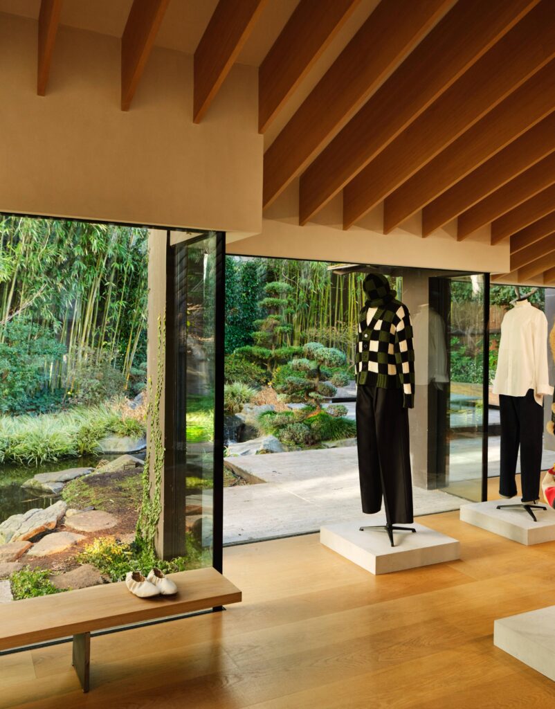 The setting itself deepens the collection’s narrative. Located in the Bastille district, the 1,600 square metre house was designed by Kenzo Takada and architect Xavier de Castella and completed in the early 1990s. Conceived as an “oasis house,” it functioned as both private sanctuary and creative hub, hosting meditation, photoshoots, showrooms, and gatherings. Drawing inspiration from Takada’s father’s teahouse in Himeji, the home integrates tatami mats, shoji doors, a tea ceremony space, and a Japanese garden with a koi pond. Takada once meditated in a specific spot facing the water, a ritual Nigo reenacted during his first visit.