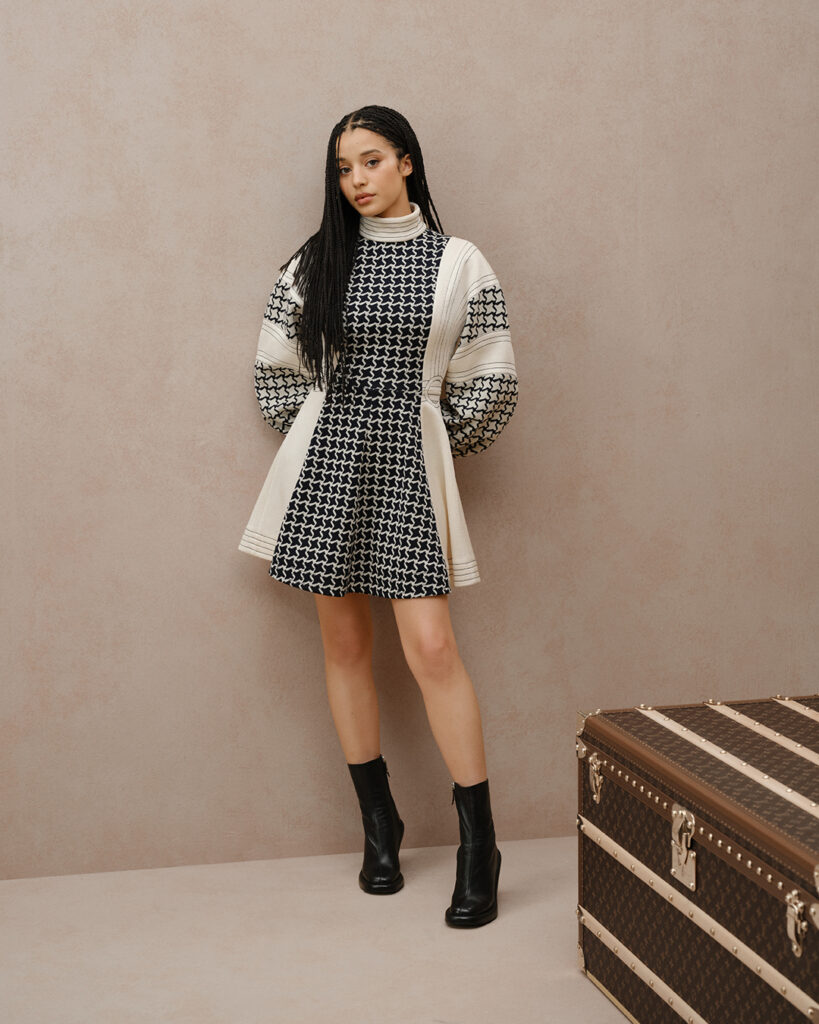 Since 2024, Louis Vuitton has fostered a relationship with Infiniti. Her attendance at the Women’s Fall/Winter 2025 and Spring/Summer 2026 shows by Nicolas Ghesquière marked the start of her association with the brand. Since then, Infiniti has been dressed by Louis Vuitton for the world premiere of One Battle After Another, wearing a custom champagne satin hand-embroidered gown inspired by an archived look from 1860. At the 5th Annual Academy Gala in Los Angeles, Infiniti wore a Louis Vuitton gown with a garment-dyed green silk taffeta bustier and overstitched pleats.