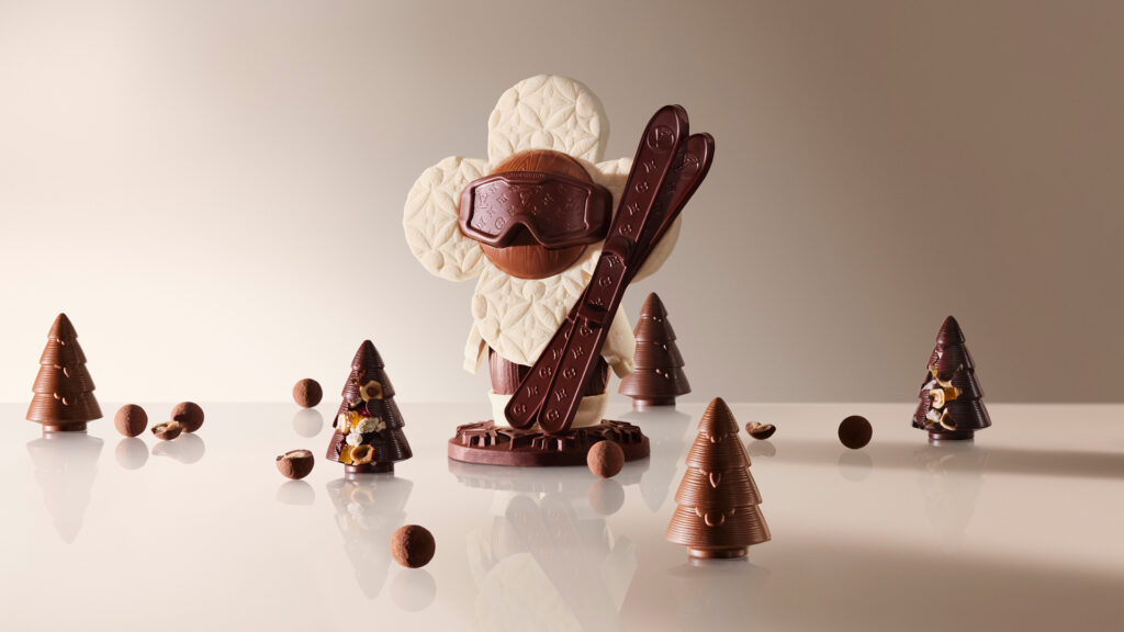 The House’s mascot, Vivienne, also makes an appearance in skiwear. Made with hazelnut gianduja, white and dark chocolate, and praline, the figure brings a sense of lightheartedness to the collection. Aptly named “Vivienne Ski,” she carries two chocolate skis and wears snow goggles.