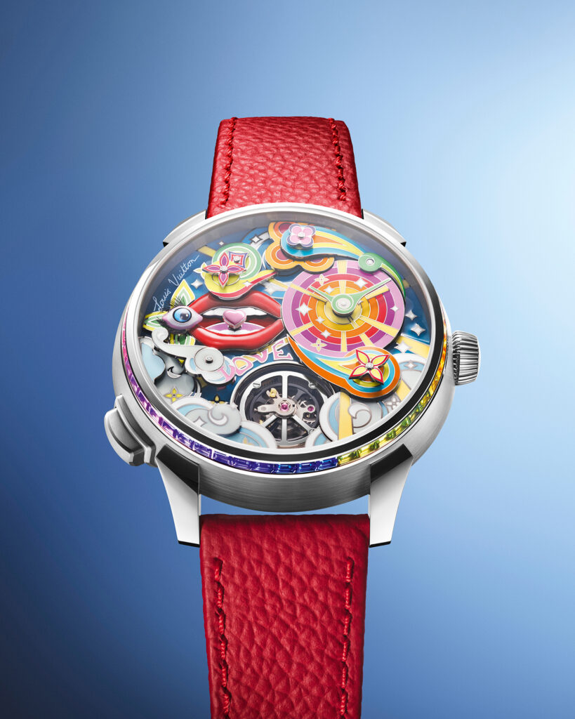 “LOVE” is spelled out above the tourbillon aperture, and a pair of glossy red lips is just left of the dial. An eye looks towards the dial, with lush eyelashes made of real feathers. The multilayered designs bring color into a collaging harmony, with the Louis Vuitton floral motifs spotted throughout.