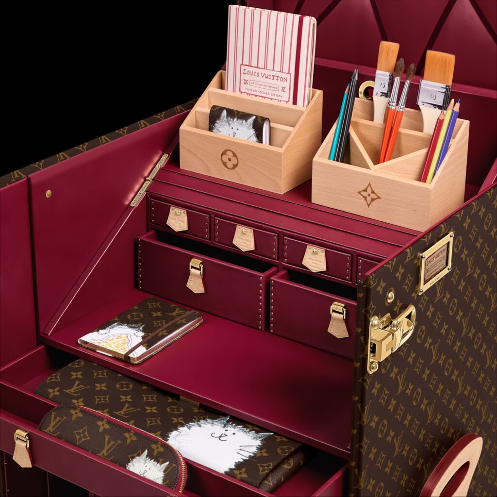 Comfortable and lightweight pieces, like a silk pajama set, form the collection’s wardrobe. Cashmere cardigans and pullovers offer a luxurious touch without sacrificing our desire to feel cozy in transit. Coddington also reinterprets the 1929 Secretaire Stokowski, a trunk featuring artist supply storage, a foldable desk and chair, and a cozy space designed for a feline companion at the trunk’s base.