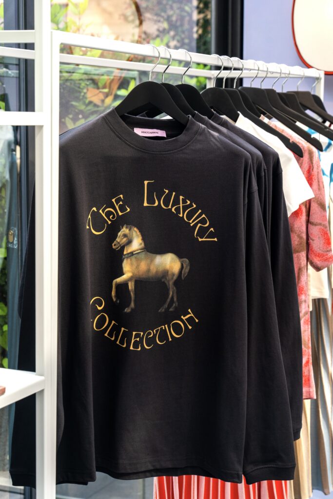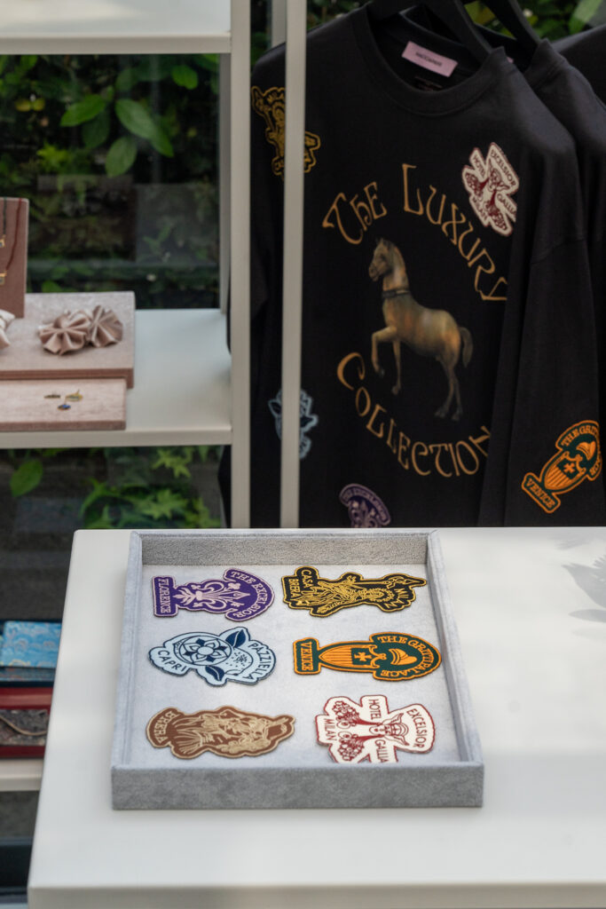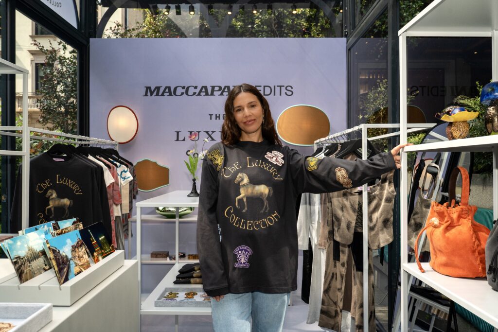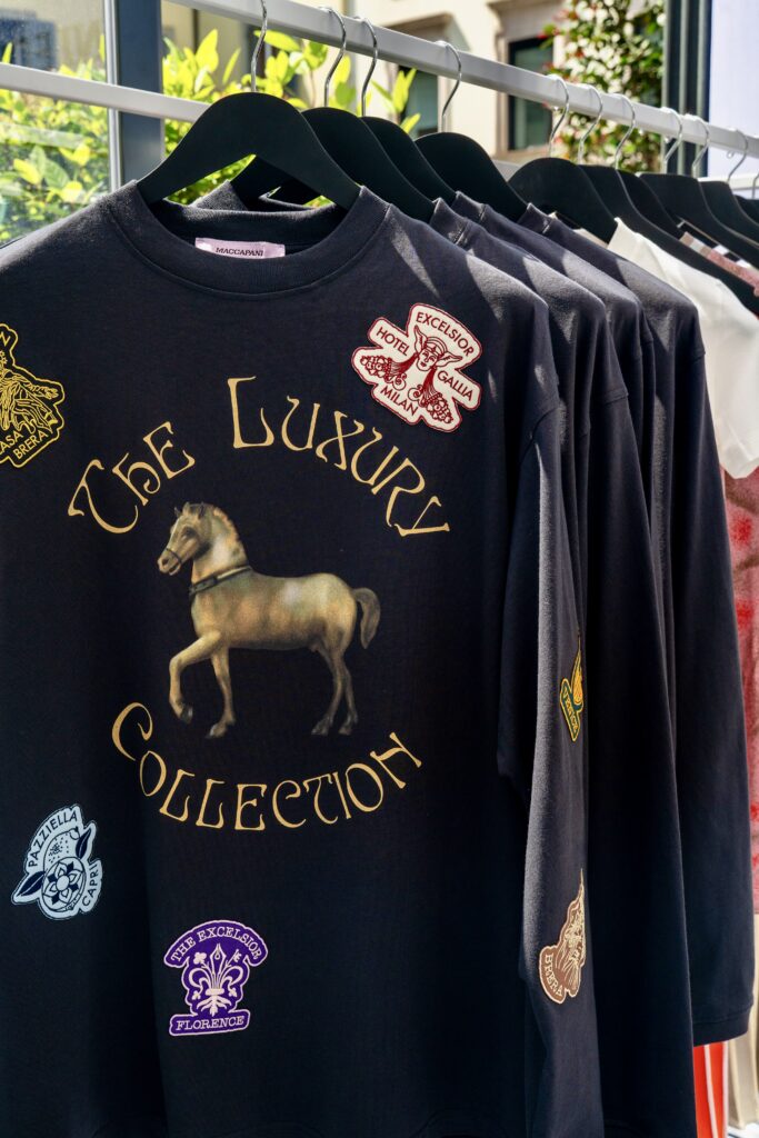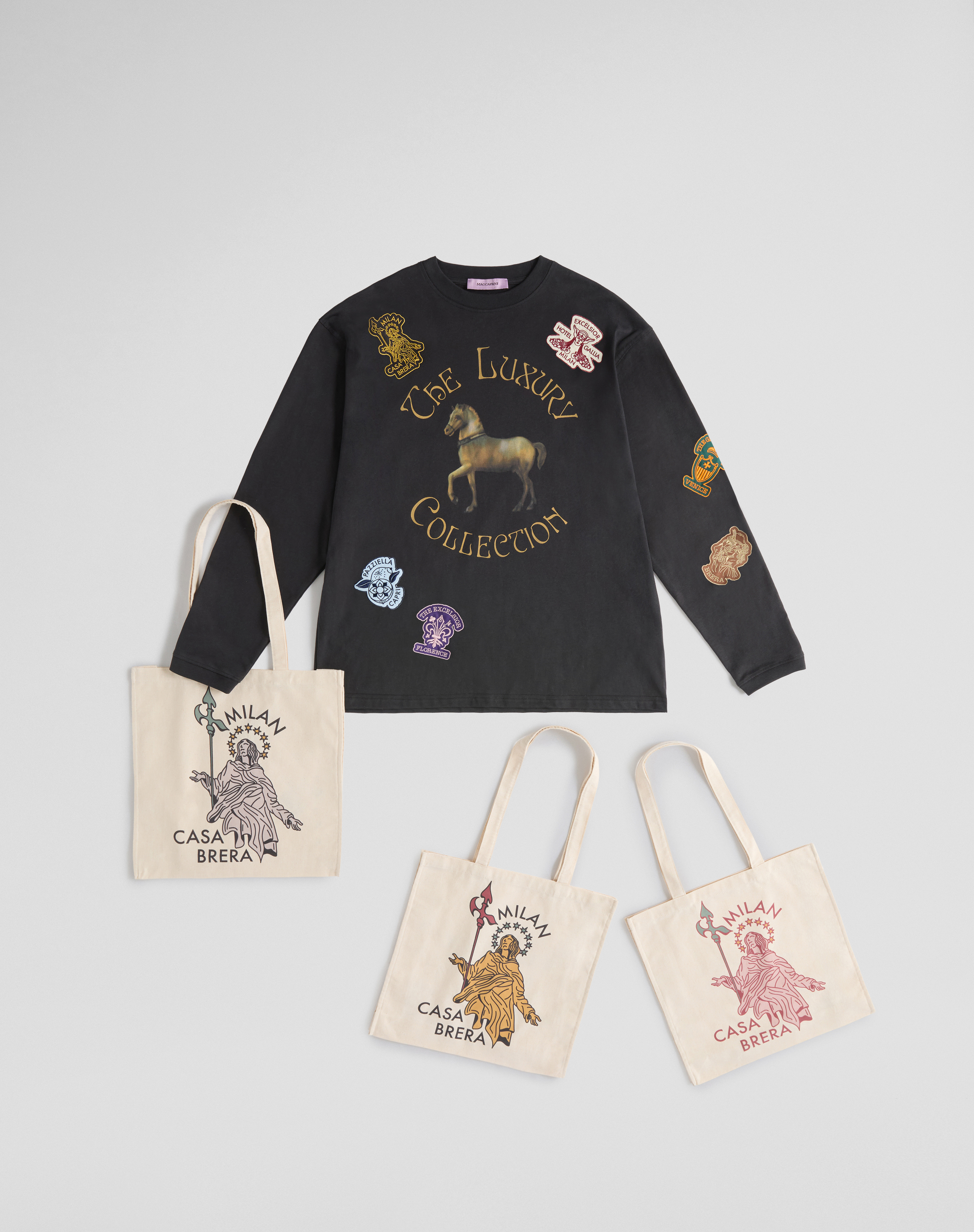 The capsule features a Moto T-shirt with a Horse of Saint Mark motif drawn from the brand’s CIGA heritage, six embroidered patches referencing iconic hotels across The Luxury Collection’s Italian portfolio, and a Casa Brera tote in multiple colors. What surrounds it is where Margherita’s eye really shows. She has personally curated a selection of Italian artisan brands for the space, including Il Papiro, the Florentine paper atelier known for its hand-marbled stationery; Iacobella, a Florence-based leather handbag studio; Lucia Zamberletti, a Milanese ceramic artist with a sculptural practice worth knowing; Yali Glass Murano candleholders; Merù Gioielli enameled pendants; and Mapi jewelry boxes. Select pieces will be available online through both The Luxury Collection and Maccapani’s e-commerce platforms.