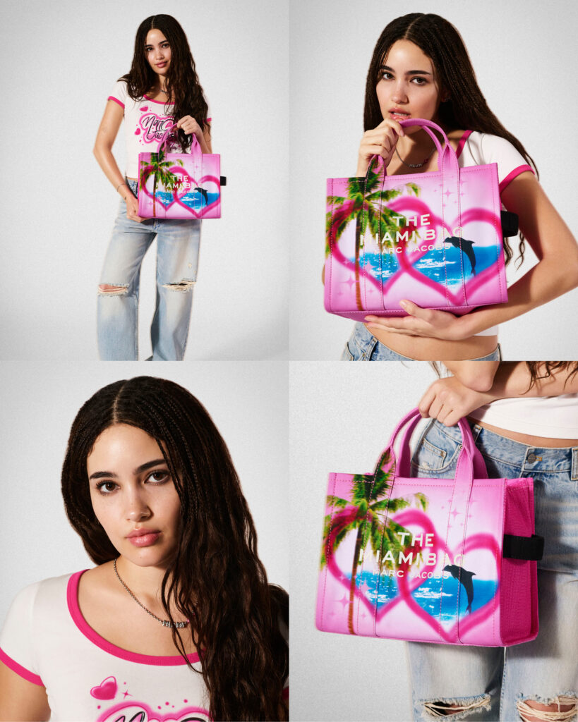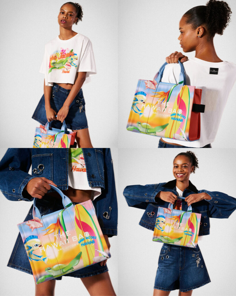 The brand’s recognizable tote bag serves as the heart of the collection with each city inspiring bold and particular designs. For the London tote, there are nods to punk through safety pins alongside the classic red telephone box on a tartan-print. Airbrushed aesthetics are referenced through the design of the Hawaii and Miami totes, and pin-up is used on the Hollywood tote and tee. The downtown, colorful aesthetic associated with Jacobs is revealed throughout the capsule.