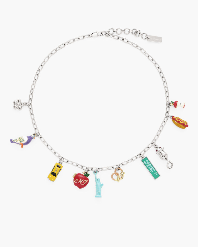 In addition to bags, certain cities are featured through other garments and accessories. Jewelry from the capsule has a cheeky feel evidenced by bright yellow taxi-cab earrings and a New York charm necklace with classic New York symbols, like a pretzel, hot dog, the Statue of Liberty, and the city’s unofficial mascot: the pigeon.