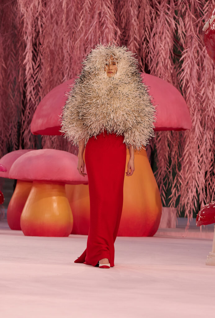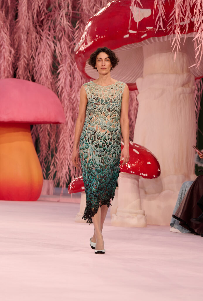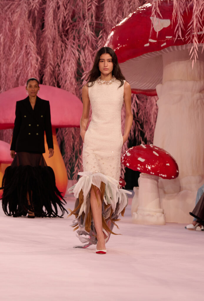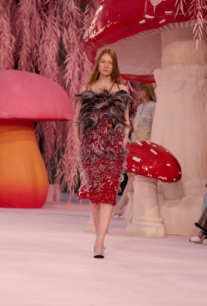 As the show progresses, a subtle metamorphosis takes place. Women transform into birds, imagined through couture craftsmanship rather than literal feathers. From raven black tailoring to richly colored plumage suggested through embroidery, pleating, and weaving, silhouettes evoke creatures ranging from pigeons to spoonbills and cockatoos. Congregating briefly in an enchanted woodland, the birds ultimately take flight. In that fleeting moment, Chanel Haute Couture offers a pause of poetic freedom, then disappears.