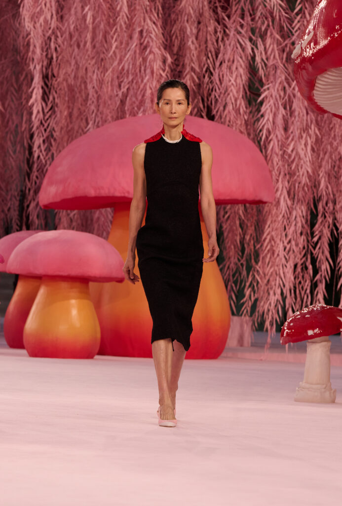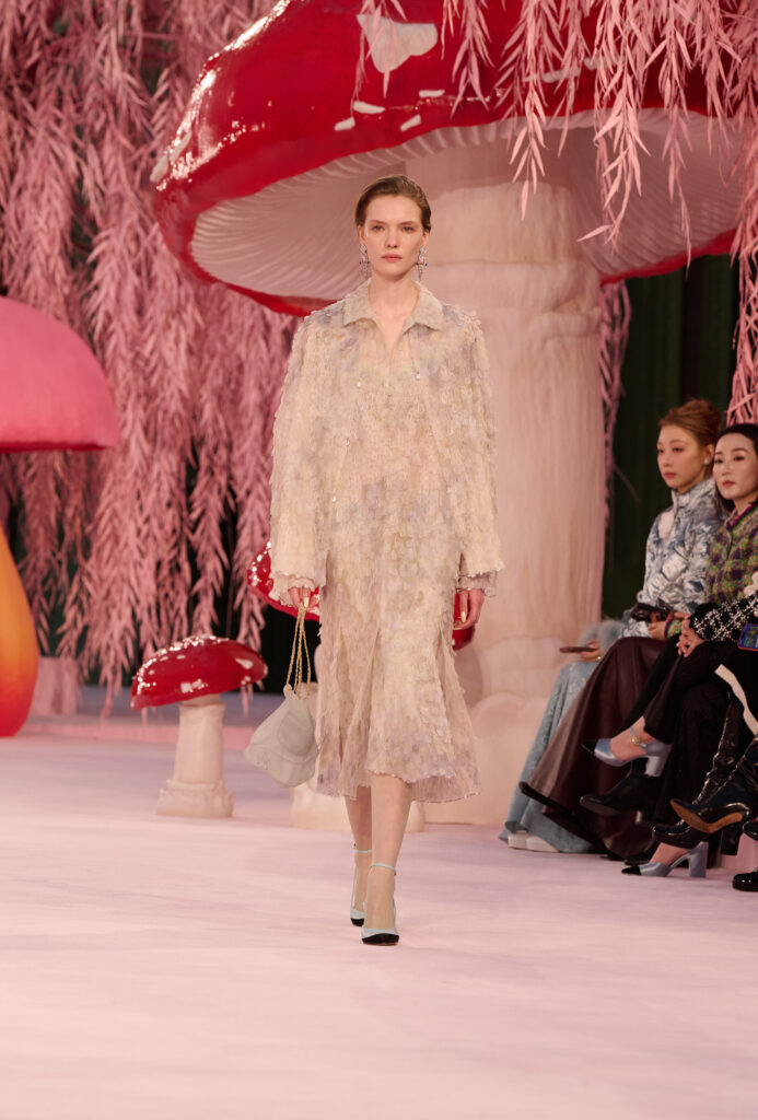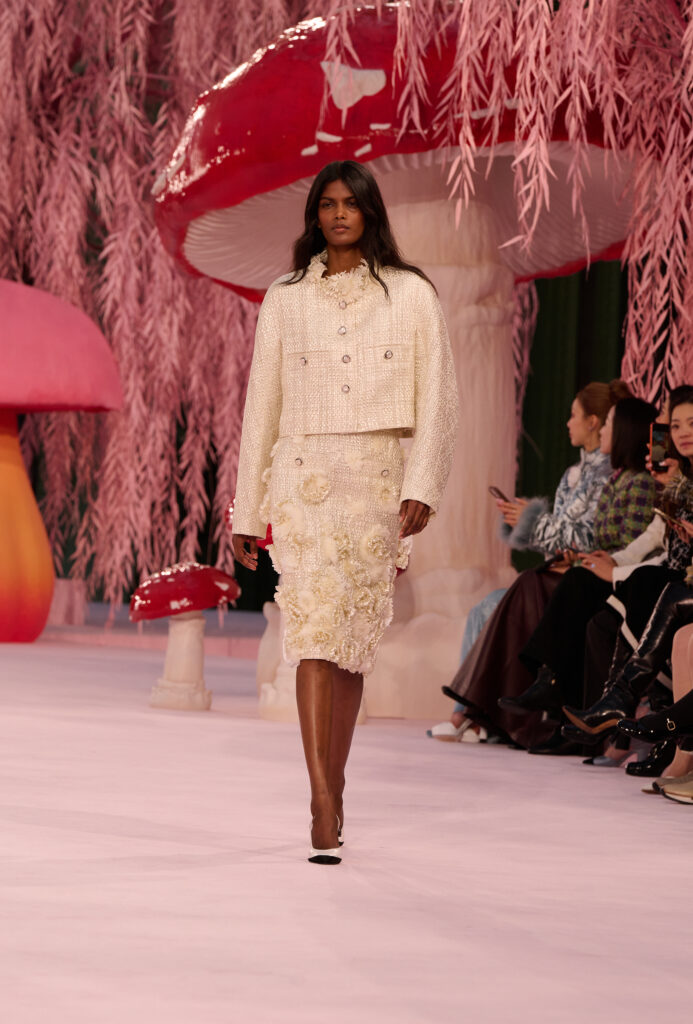 The collection unfolds as a quiet, poetic meditation on lightness and movement, with individuality at its center. A restrained yet evocative setting frames the clothes like a haiku, suspending time and allowing each look to tell its own story. The opening Chanel suit, rendered in translucent silk mousseline in tender hues, feels almost like a memory. Embroidered love letters, bottles of N°5, and flashes of red lipstick appear as intimate tokens—slipped into pockets, stitched inside garments, or suspended from signature chains—revealing an interior life made visible.