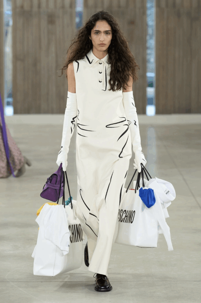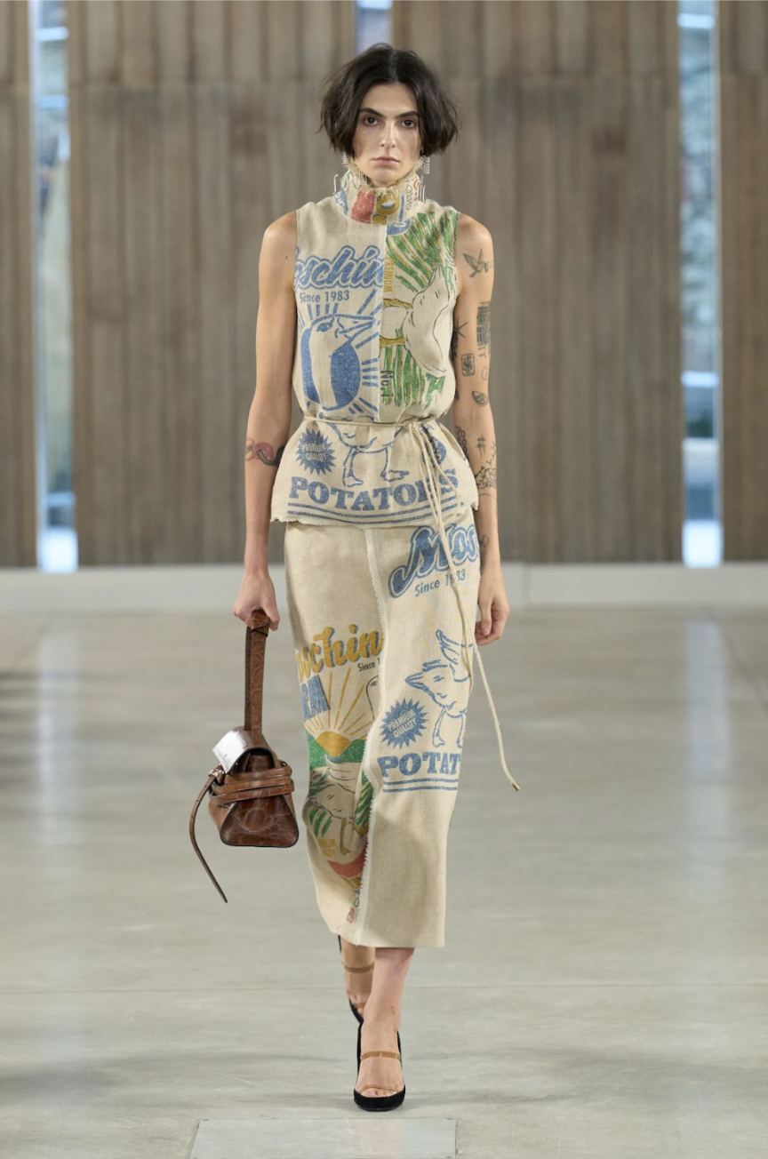 Forget freshman Philosophy 101; the “something in nothing” at Moschino SS26 is rendered with the house’s signature irony and play. Titled NIENTE (“nothing” in Italian), the collection leans into the ordinary and the everyday, the humble and the human. Perhaps the latest in cultural recession indicators, the collection aggrandized potato sacks, apple boxes, saucepans, and buckets.