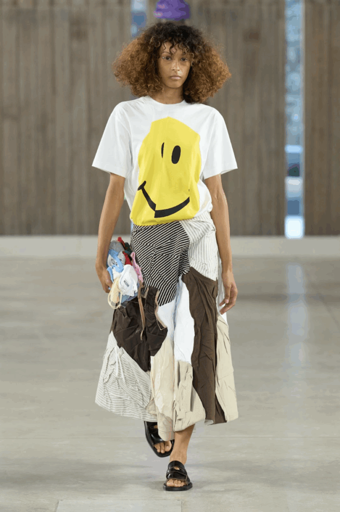 Moschino’s manifesto anchors the collection with “reuse, recycle, reimagine” as its core tenets. More than environmental commandments, they echo the philosophies of Franco Moschino: reconsider, revitalize, and redefine. References to the Moschino archives include trompe l’oeil effects, the beloved Smiley, and the iconic ‘90s newspaper print. These nods lay the groundwork for the collection, where anything can be something (especially a handbag).