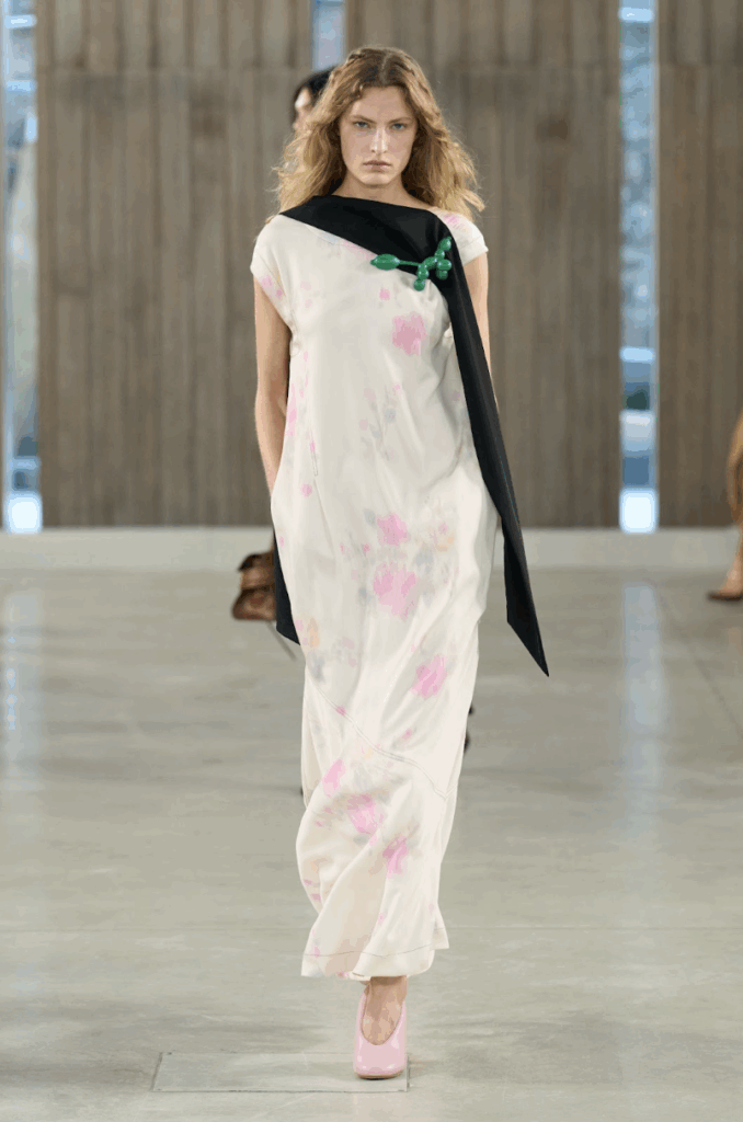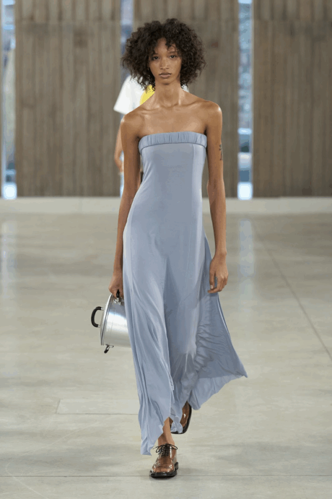 But the true surprise of Moschino SS26 might be the classically beautiful, “wearable” pieces that are lax on shock factor. A silky sheath dress in a watercolor palette; a nearly-Klein blue sweater polo; a so-light-pink-it’s-almost-white Western tailored button down; and a sleek, slate-blue strapless dress. The show even closed with a flowy white dress pulled into Roman-esque wrappings and pleats. But when creative director Adrian Appiolaza took his bow in a T-shirt bearing a printed baby, it was clear: this is still Moschino.