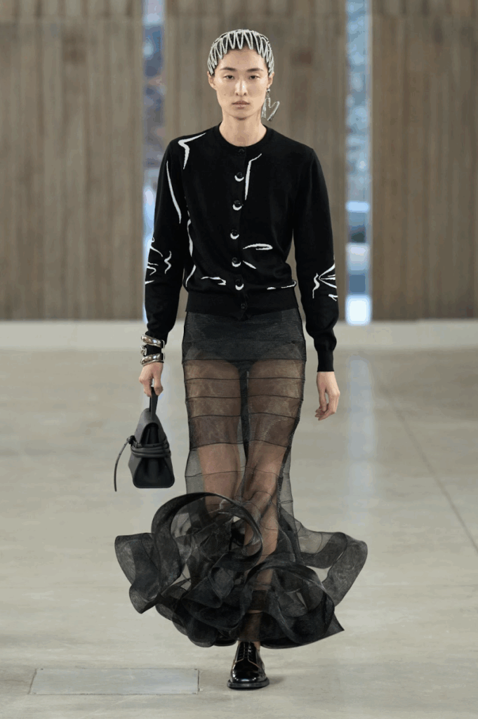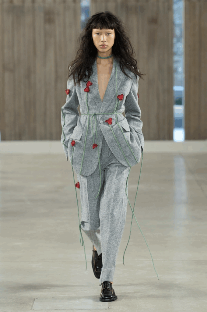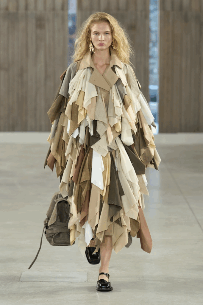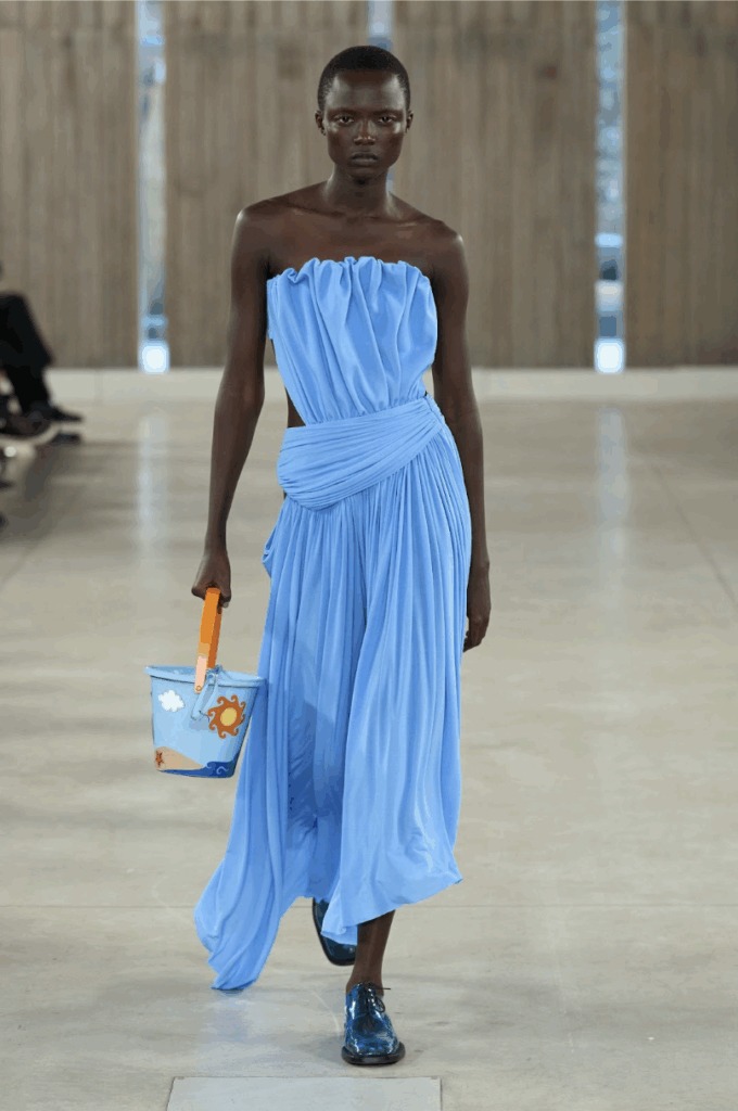 That includes…a bundle of newspapers, the apples from your grocery haul, your childhood beach bucket, the mangled shipping box housing your latest return, or the saucepan from last night’s pasta. But beyond the slapstick accessories and potato sack sets, the luxury inside Moschino SS26 is in its joy of craft. Knits are made with technical raffia, recycled from plastics. Embroidery comes in the form of flowers strewn across dresses and tailoring. The “Tie Me Bag” is executed in rubber and “dressed” in cloth. Rope, wood, lacing, ruffling, and knotting are toyed with and elevated.
