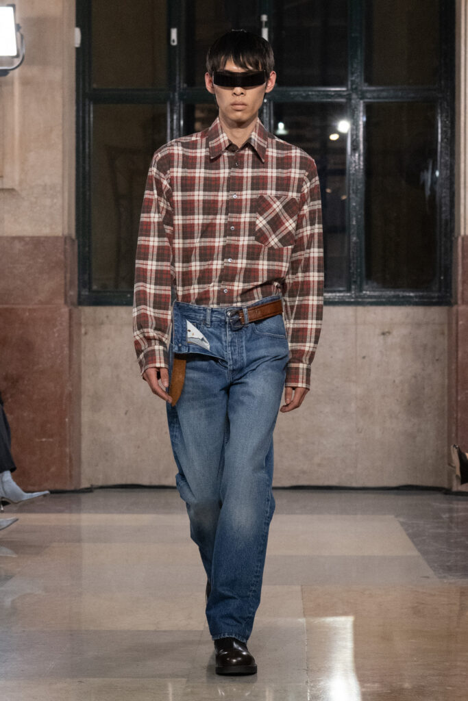 The ‘80s references threaded through the lineup were less nostalgic than infrastructural. Full skirts with softened, whimsical hems swayed past in conversation with farmstead flannels and mohair turtlenecks, and pieces alike. Fleece quarter-zips and track jackets disrupted tailoring; office shirts were spliced, loosened, and re-proportioned. Corporate archetypes were gently undone—lapels relaxed, shoulders slipped, trousers cropped mid-calf, and tucked into boots with deliberate awkwardness.