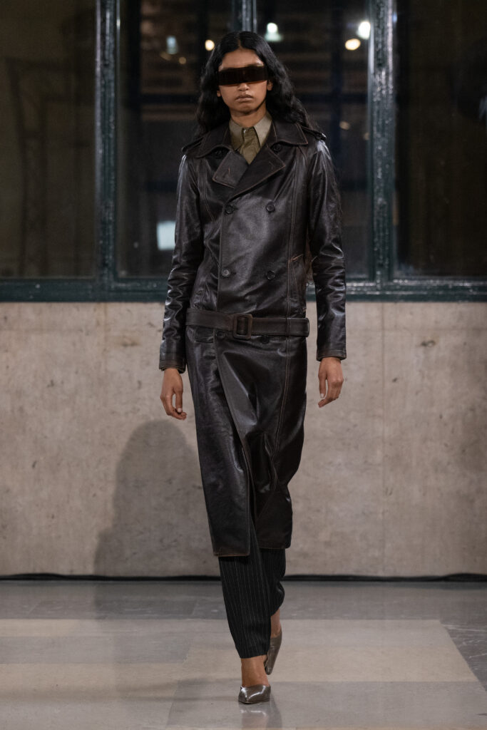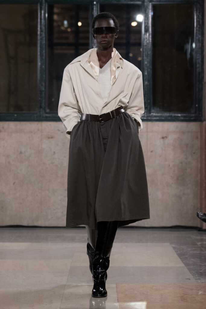 Silhouettes were the true protagonists. Pants ballooned or narrowed with architectural intent, hems hovering at transitional lengths that made the wearer appear perpetually mid-stride. Layers clung and peeled away from the body in equal measure. Trenches belted at the hips rather than feminizing the waist, allotting a confident form of androgyny.
